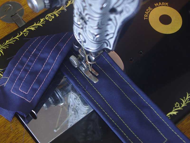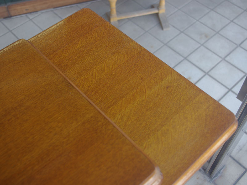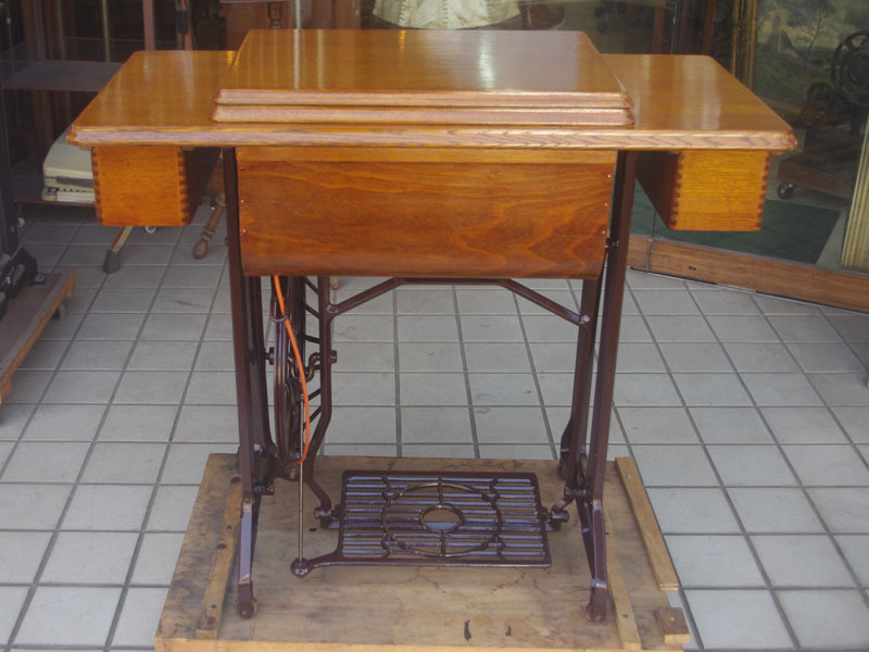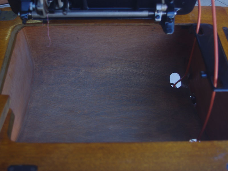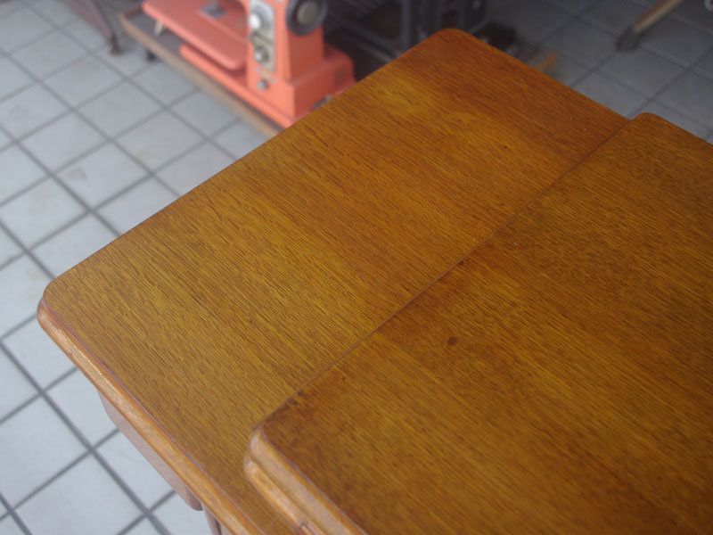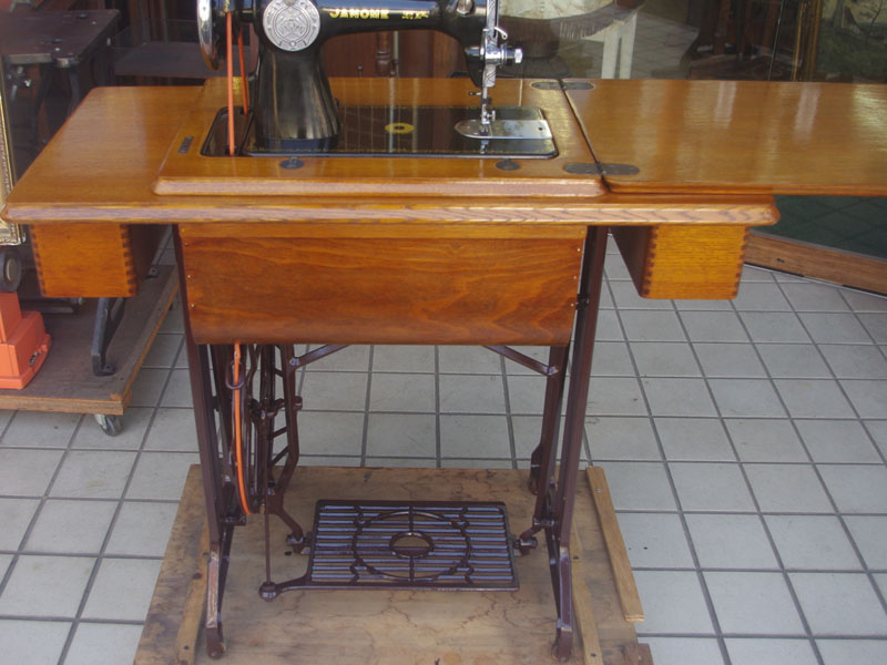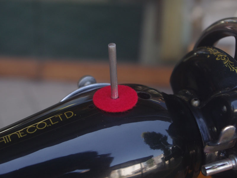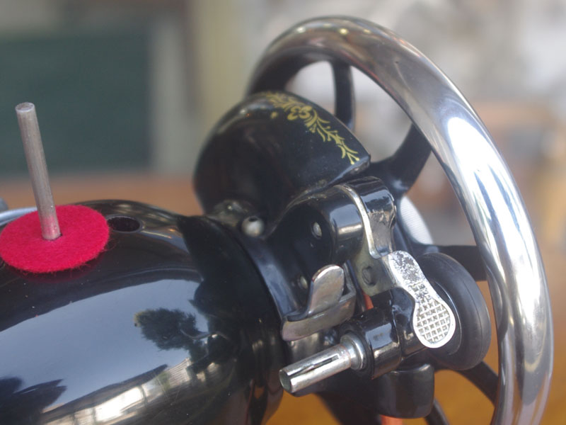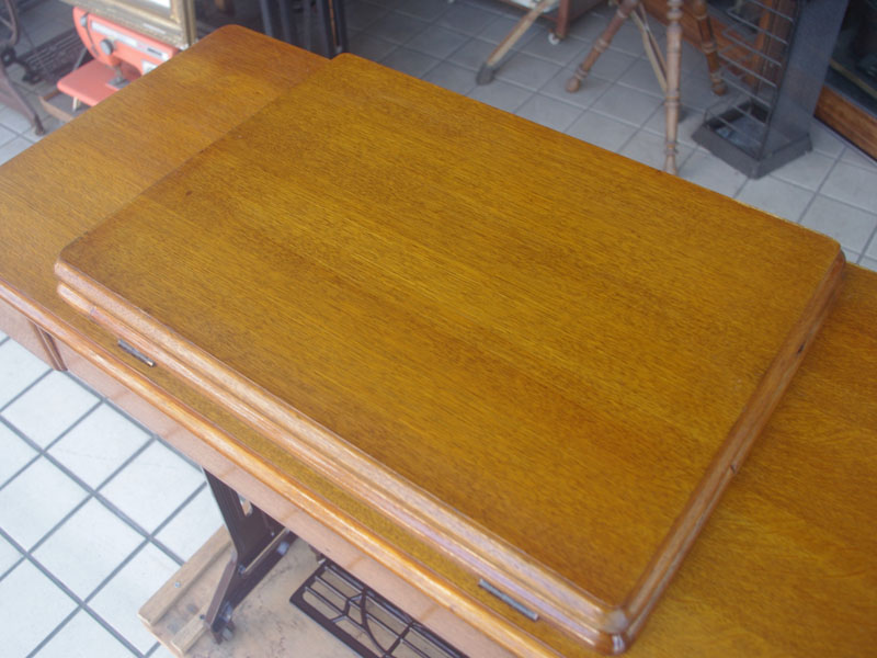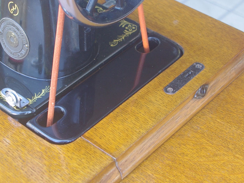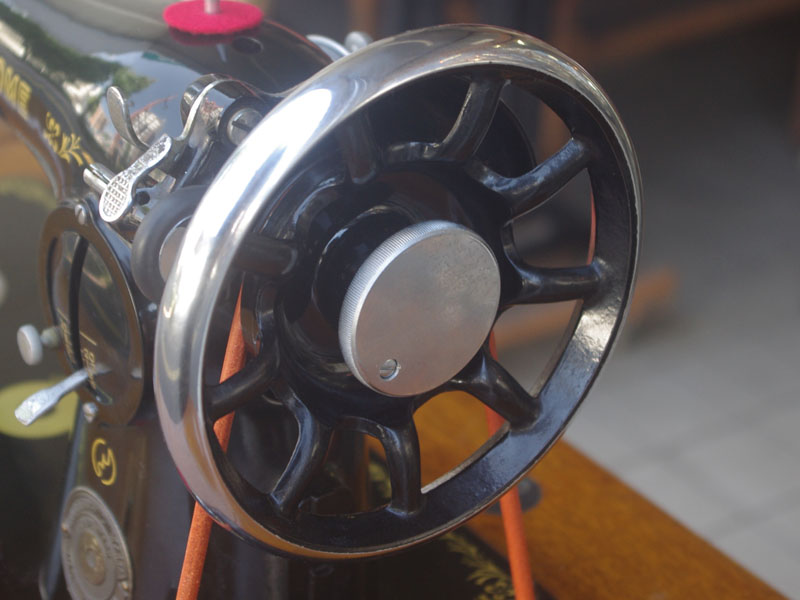 木製の台も弱っている箇所を補修し、古い塗装を落として再塗装いたしました。塗料には天然樹脂シェラックニスおよび摩耗に強いウレタンを使用しました。熱いカップやアルコール、多少の水気は問題ありませんが花瓶の水などには注意して下さい。脚は分解クリーニングをおこない再塗装をいたしました。最後に調整とグリースアップ、ミシン本体とベルトで繋げて動きを確認しております。