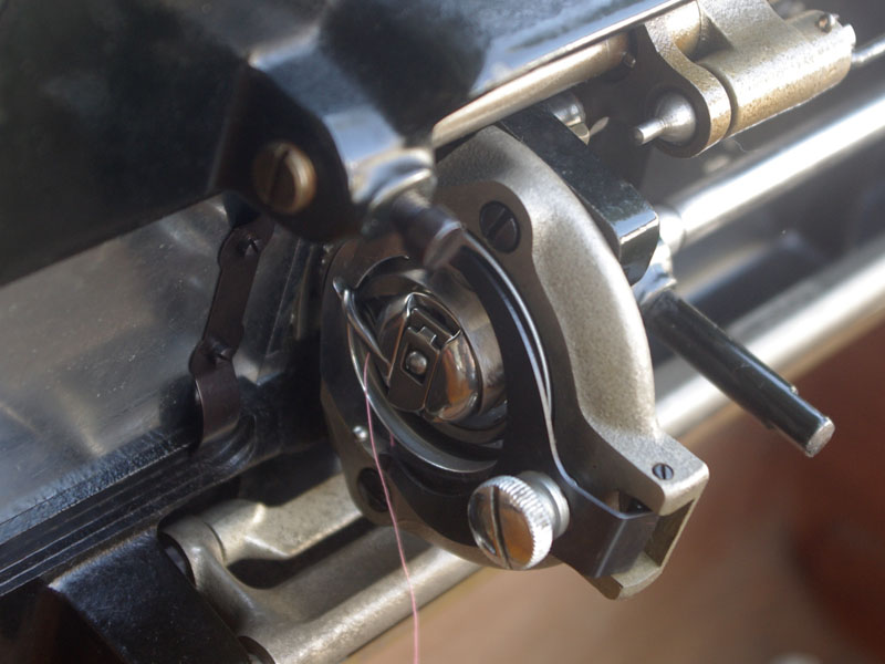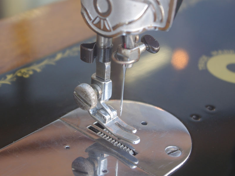 こちらのミシンも分解掃除をして古い汚れや錆を落としております。また、消耗品は交換、縫製に影響する傷などを取り除き、十分に使用できる状態に整備しております。消耗品である家庭用ミシン針・ボビンケース・ボビンなど市販されています(本体装着品は新品に交換済み)。レバー操作による縫い目長さの調整、また返し縫い機能があります。送り歯の高さを調整するダイヤルも付いています。別途穴かがり器をご用意いただければ、ボタンホールも縫えます。