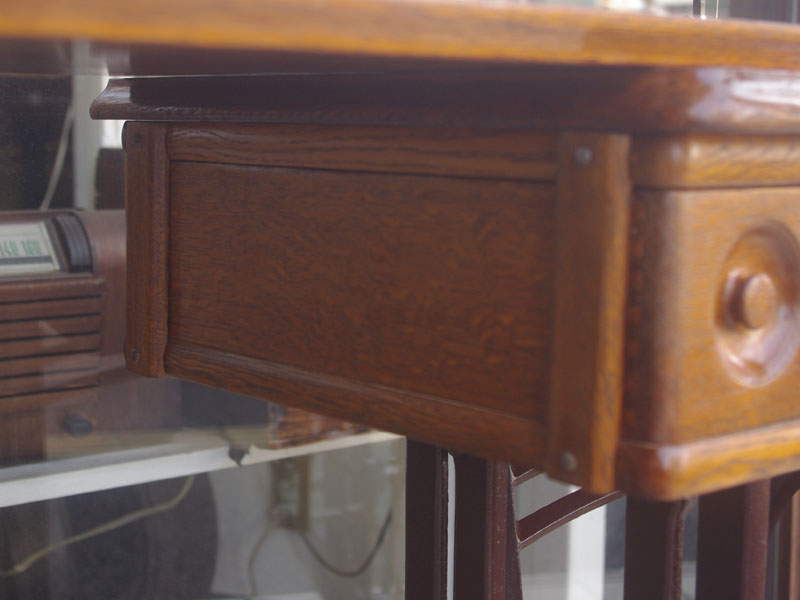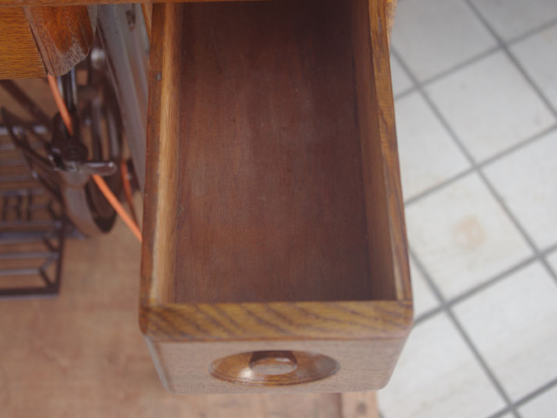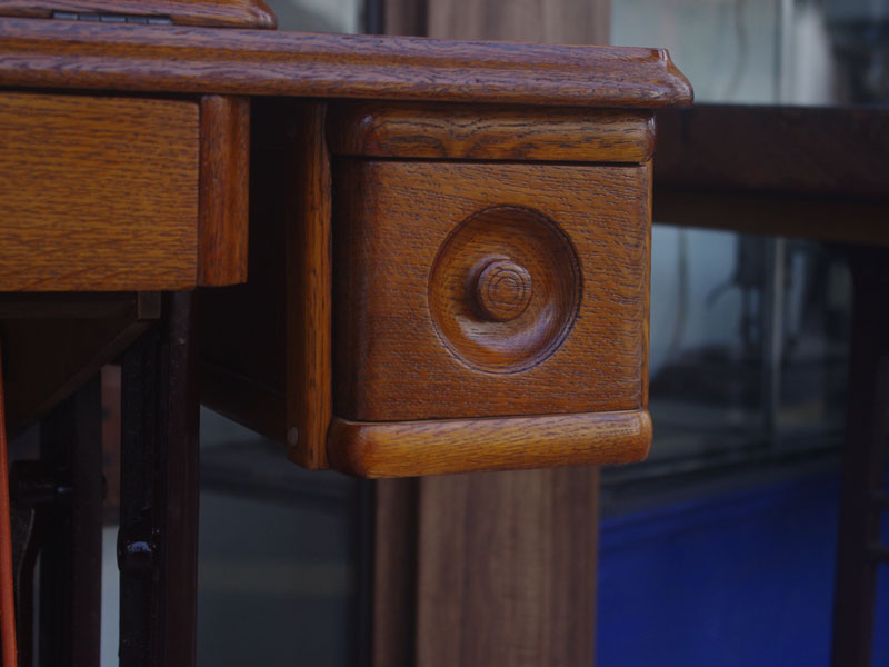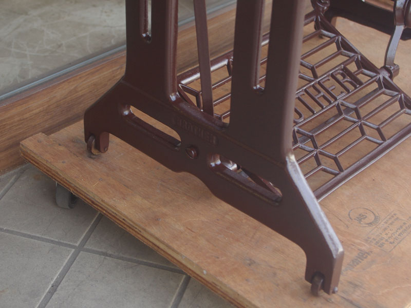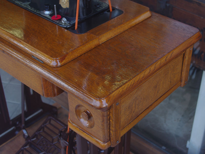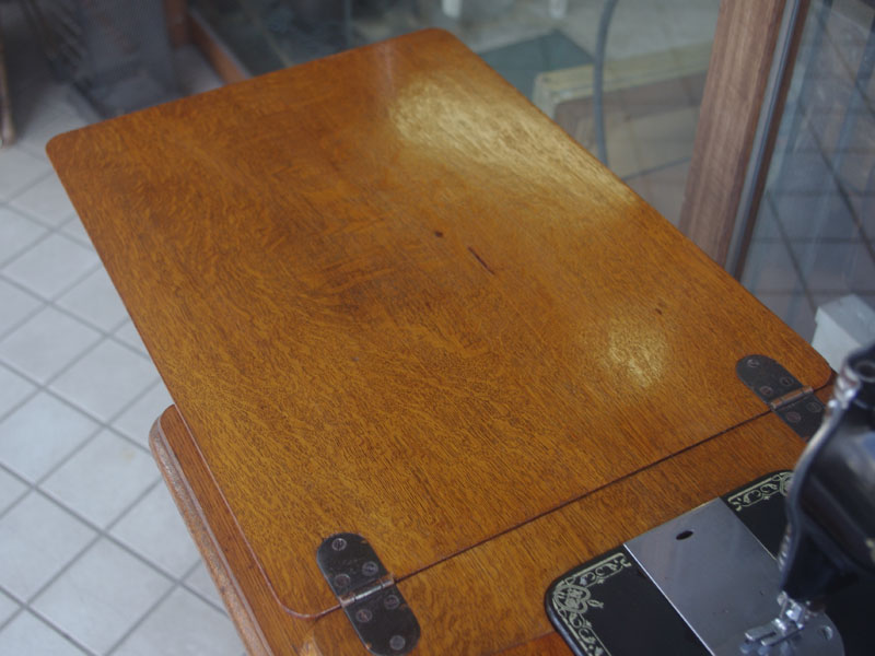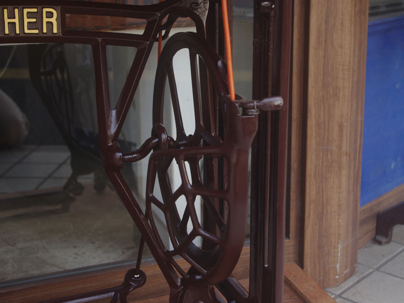 木の部分の塗装は、上の広い面で劣化が見られましたので、古い塗装を研磨して落とし、傷んだ部分の補修、下地を調整して再塗装いたしました。使用したニスは天然樹脂シェラックニスと耐久性のあるウレタンニス。念のため熱いカップやアルコール、または花瓶の水などに注意して下さい。脚は分解クリーニングと再塗装および調整をいたしました。ベルト車やペダルがスムースに動くように分解し注油をしております。最後にミシン本体とベルトで繋げて動きを確認しております。