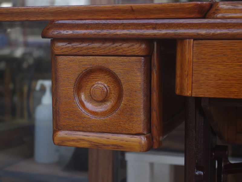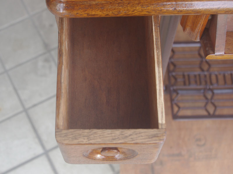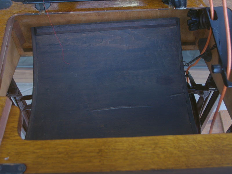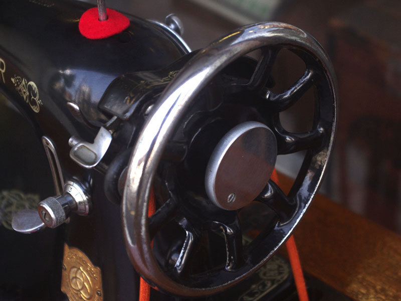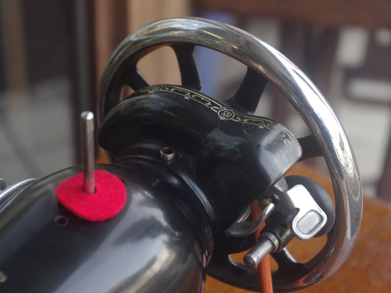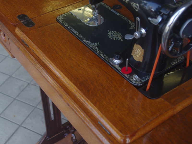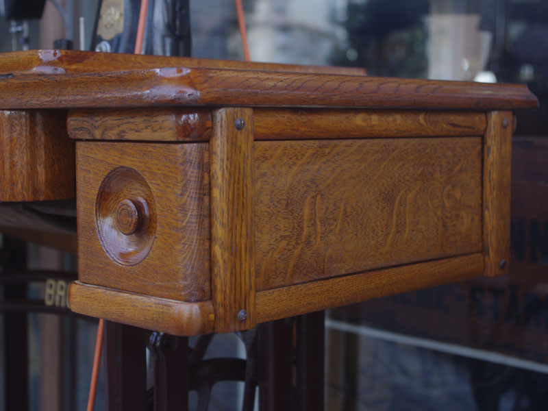木の部分の塗装は、上の広い面で劣化が見られましたので、古い塗装を研磨して落とし、傷んだ部分の補修、下地を調整して再塗装いたしました。使用したニスは天然樹脂シェラックニスと耐久性のあるウレタンニス。念のため熱いカップやアルコール、または花瓶の水などに注意して下さい。脚は分解クリーニングと再塗装および調整をいたしました。ベルト車やペダルがスムースに動くように分解し注油をしております。最後にミシン本体とベルトで繋げて動きを確認しております。
