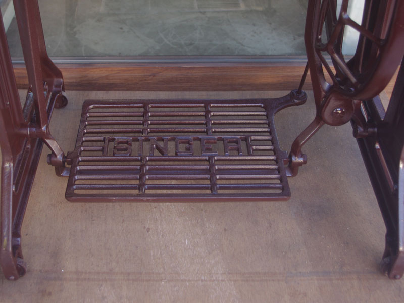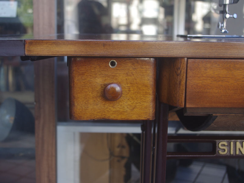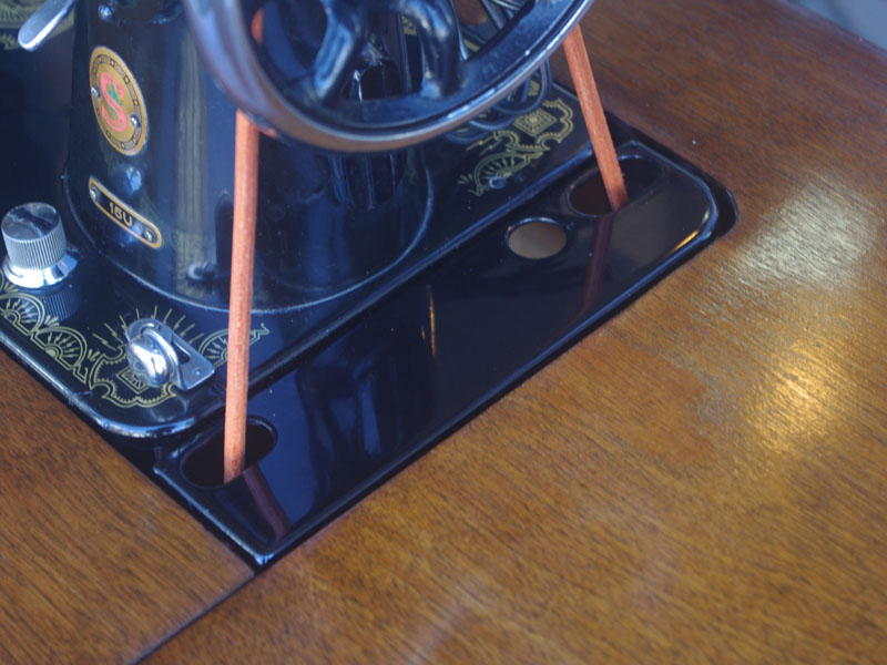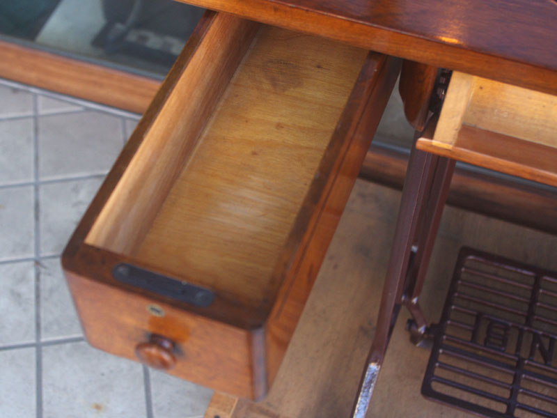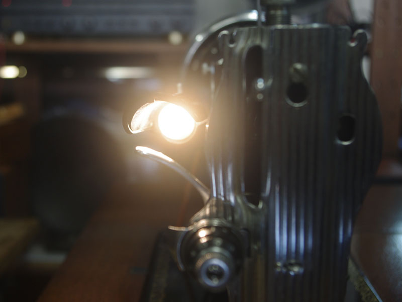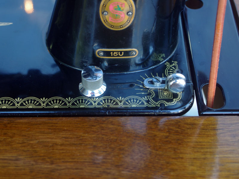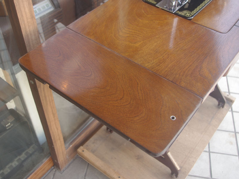 ライト付きのシンガー(SINGER)のモデル15Uです。こちらの足踏みミシンは収納時にミシンを置く場所に蓋が出来るようになっていて、テーブルのようにフラットになります。一般的な家庭用の足踏みミシンの台は段差が出来きますが、ミシンを収納しているときに上で作業するのに少し不便な面があります。それを解消したのがこちらの形のミシン台にしたのでしょうね。蓋の部分は、台の横につけて拡張テーブルのように使用できます。ライトは電球をLEDにしております。昔の白熱電球に比べるとずっと熱くなりにくいですね。