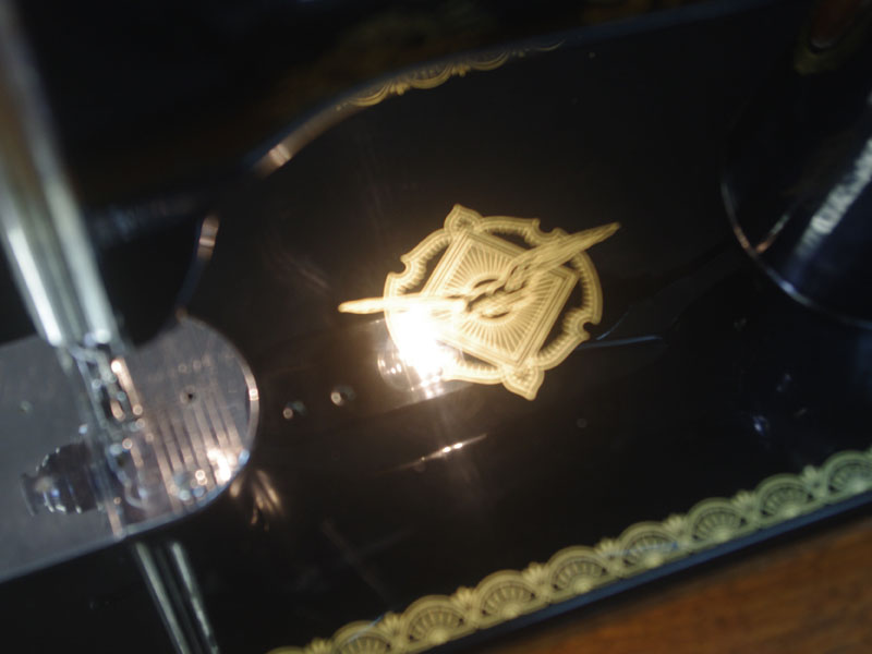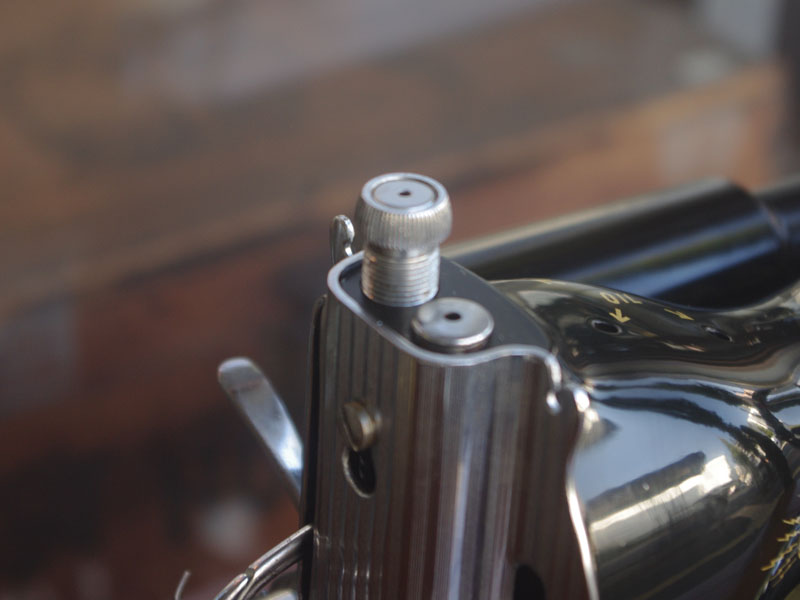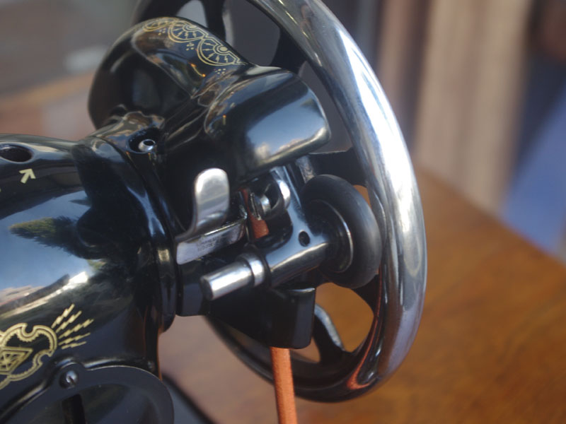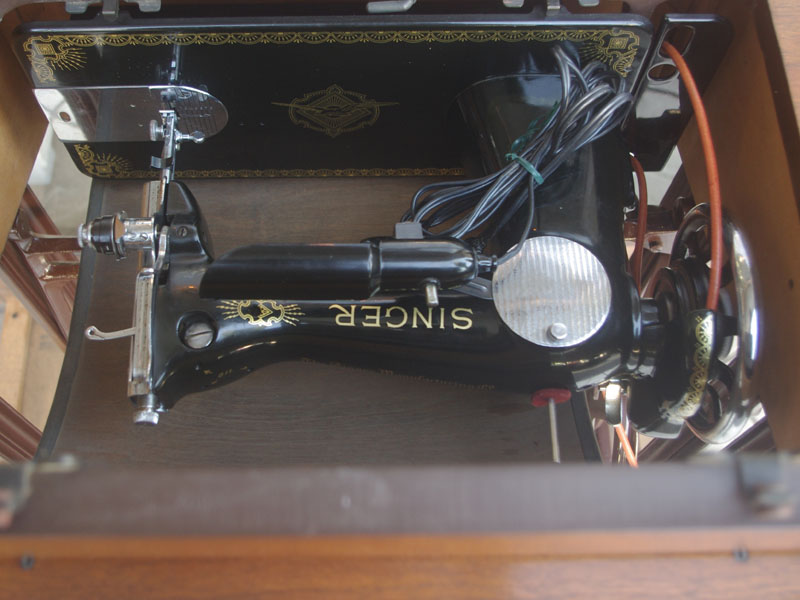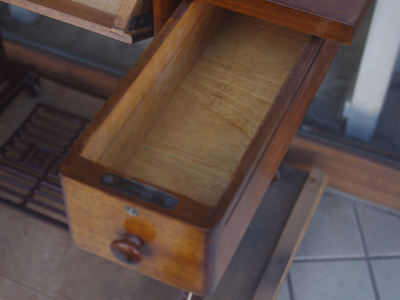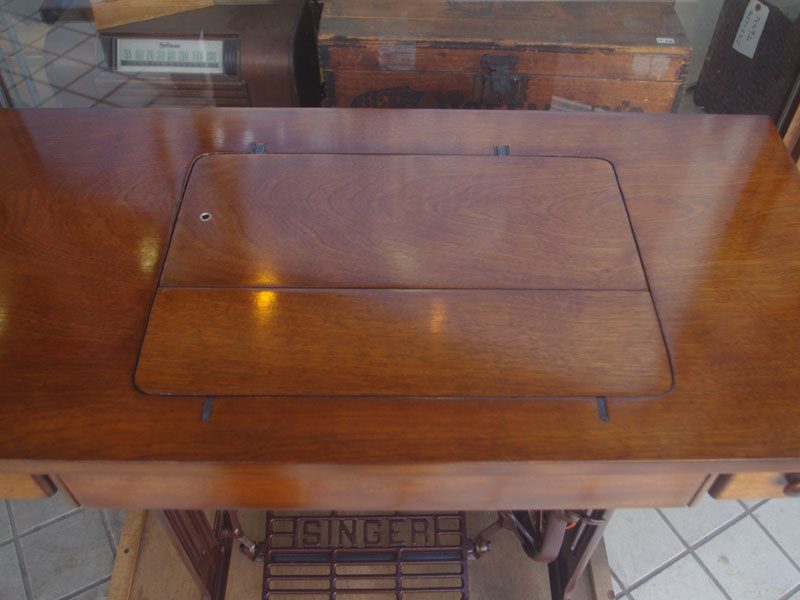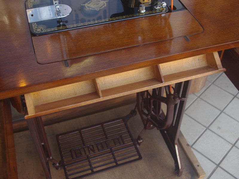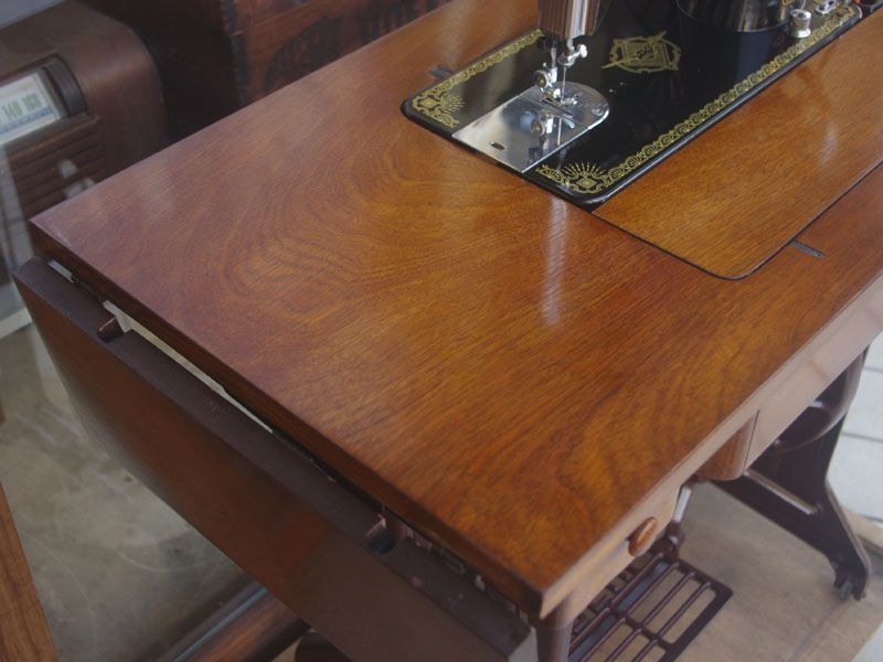 ライト付きのシンガー(SINGER)のモデル15Uです。こちらの足踏みミシンは収納時にミシンを置く場所に蓋が出来るようになっていて、テーブルのようにフラットになります。一般的な家庭用の足踏みミシンの台は段差が出来きますが、ミシンを収納しているときに上で作業するのに少し不便な面があります。それを解消したのがこちらの形のミシン台にしたのでしょうね。蓋の部分は、台の横につけて拡張テーブルのように使用できます。ライトは電球をLEDにしております。昔の白熱電球に比べるとずっと熱くなりにくいですね。