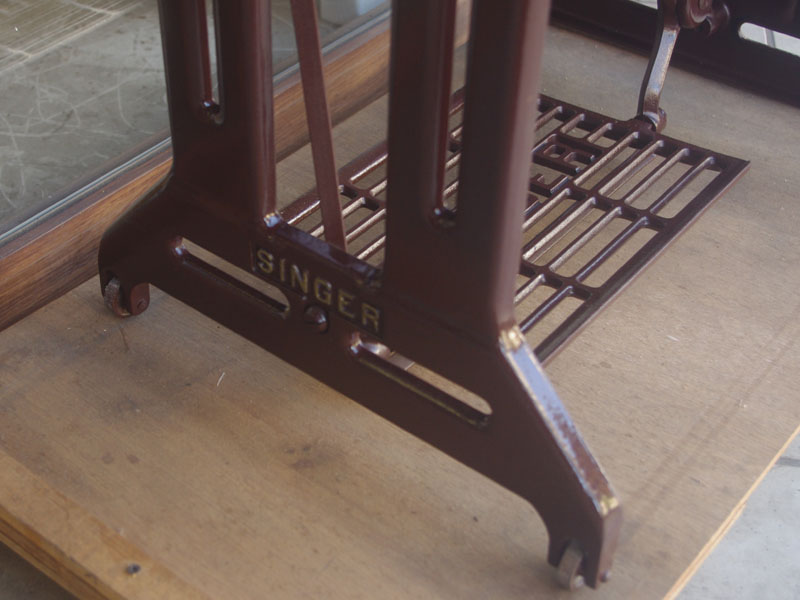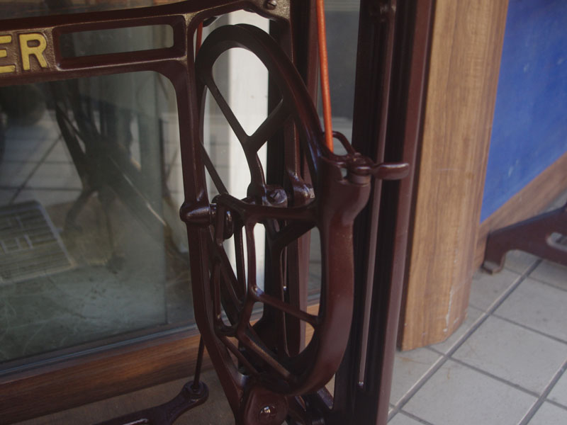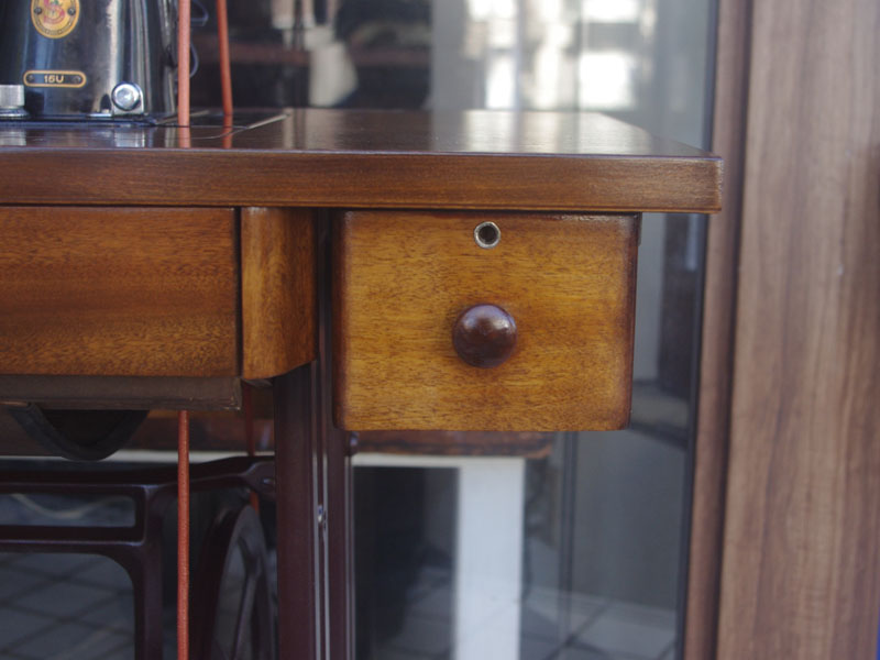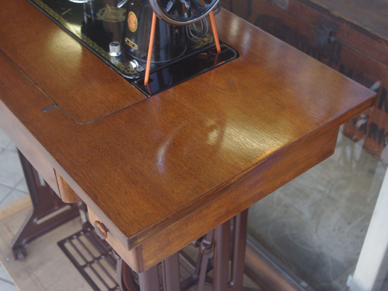 木製部分は傷んでいた部分を補修し、古い塗装を落としたうえで再塗装をいたしました。塗料はシェラックニスおよび耐久性を考えてウレタンでコーティングをしております。脚は塗装の劣化が見られましたので分解クリーニングと再塗装および調整をいたしました。ベルト車やペダルがスムースに動くように分解しグリースアップ、注油、などをしております。最後にミシン本体とベルトで繋げて動きを確認しております。
