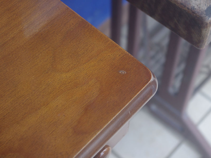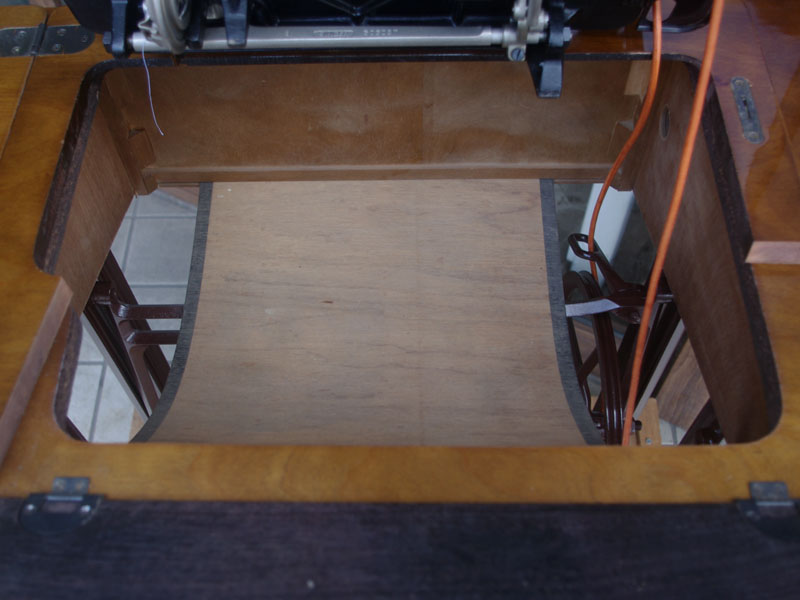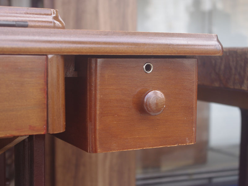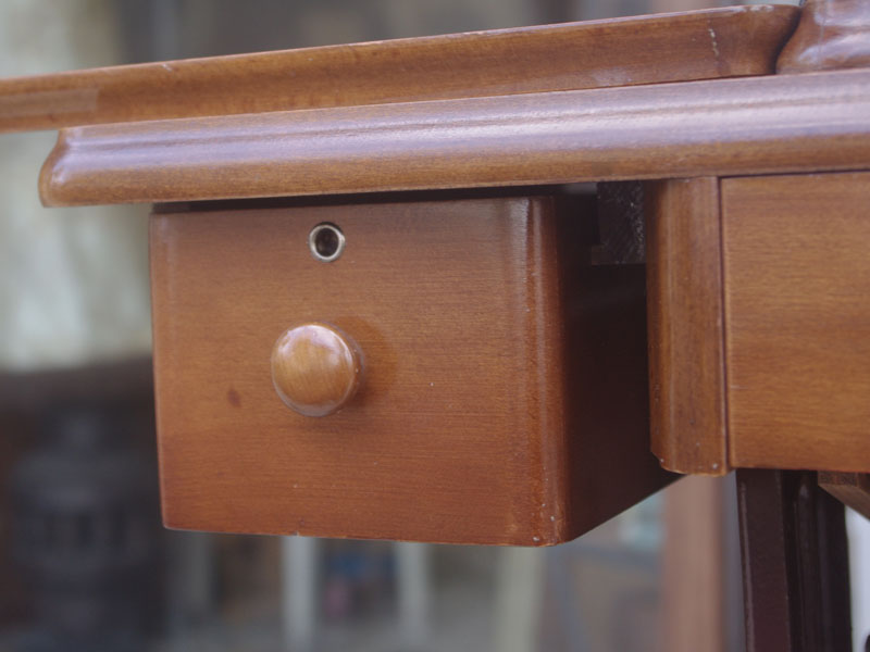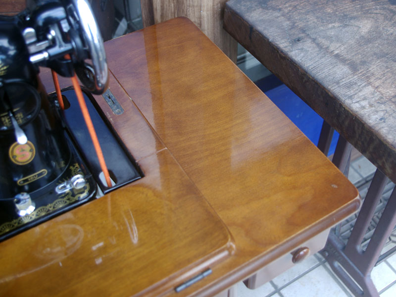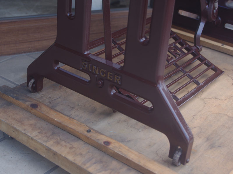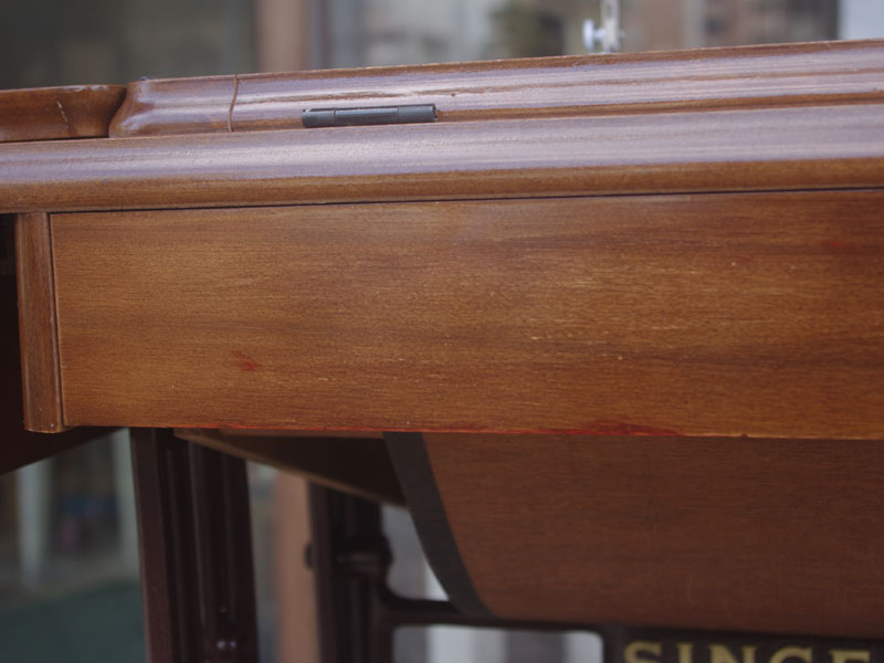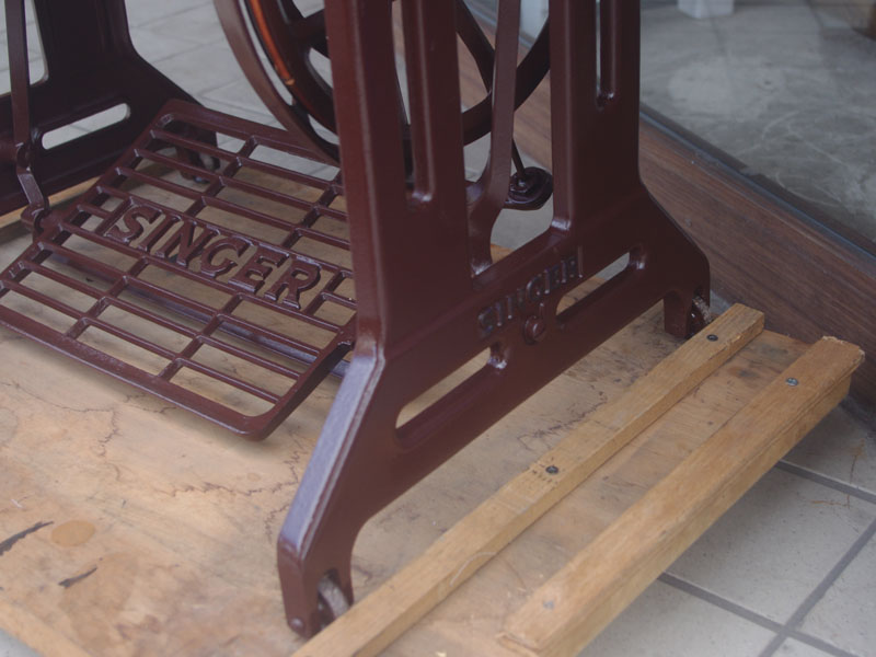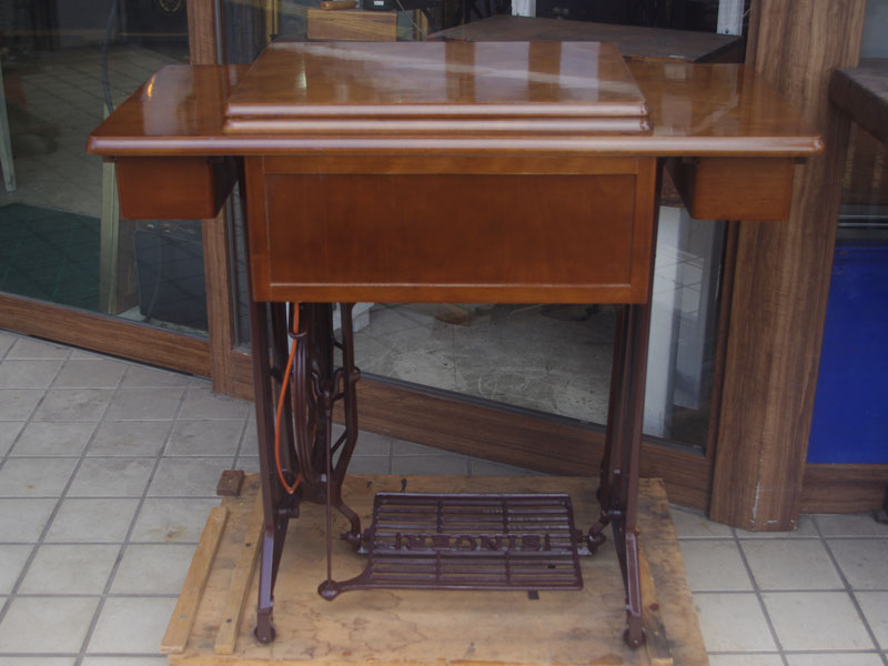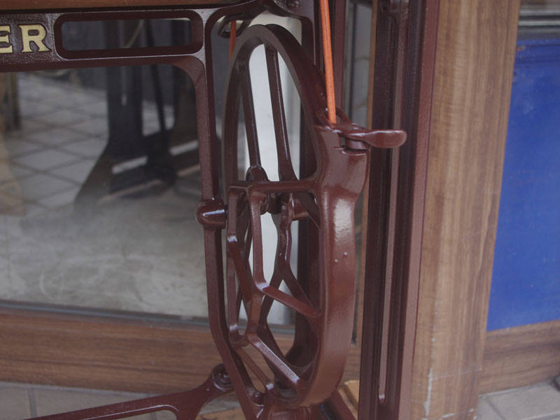 木製部分は傷みが少なく塗装の状態もとても良かったのでクリーニングと一部の補修のみで済ませております。脚は塗装の劣化が見られましたので分解クリーニングと再塗装および調整をいたしました。ベルト車やペダルがスムースに動くように分解しグリースアップ、注油、などをしております。最後にミシン本体とベルトで繋げて動きを確認しております。