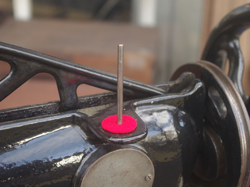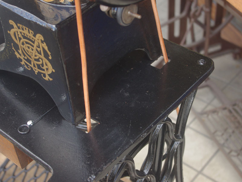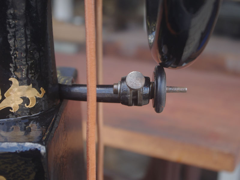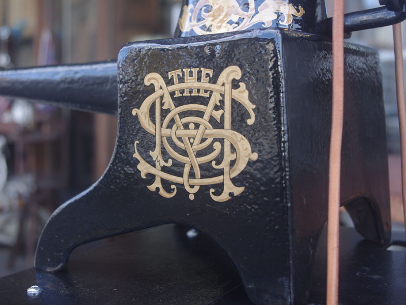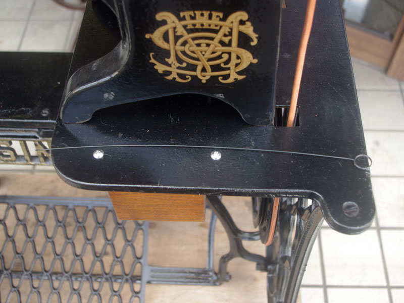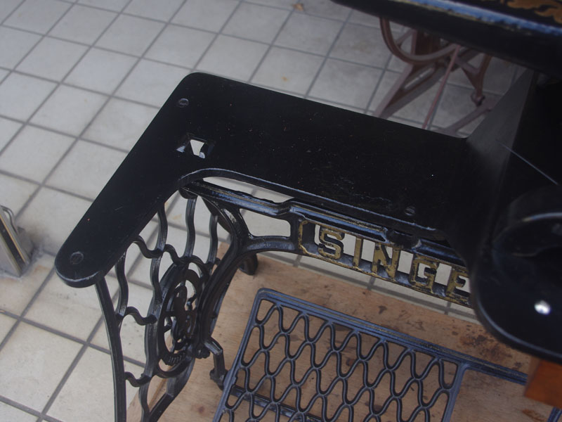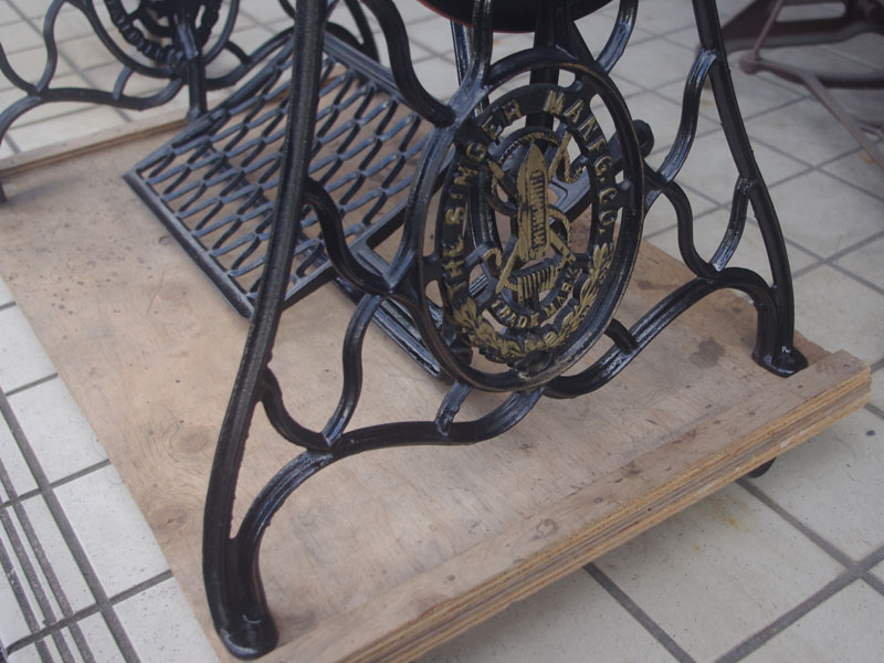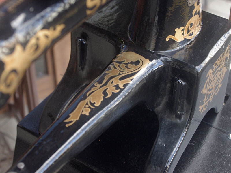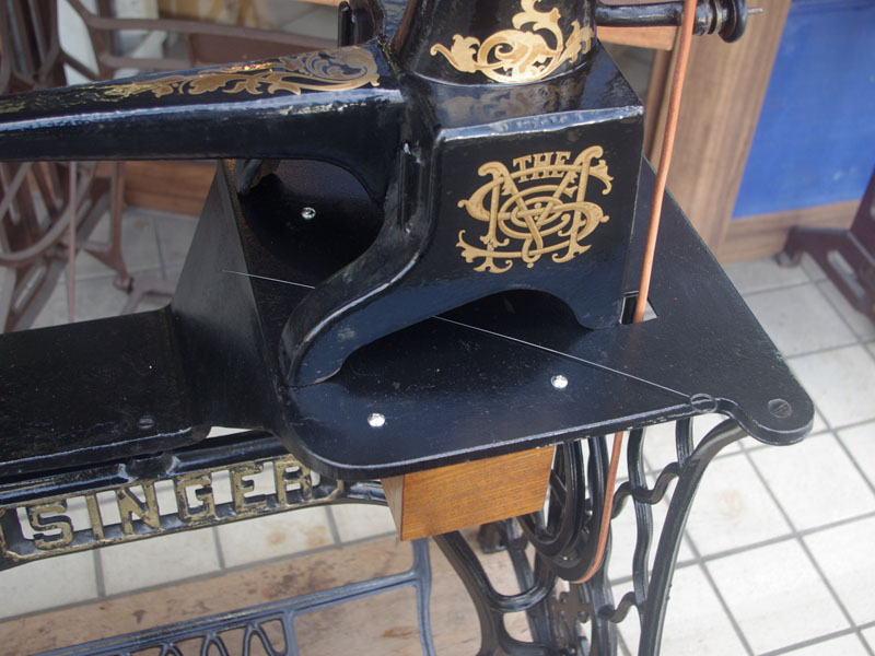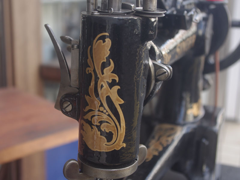 機械は当店に届いた時から黒で一度塗られている状態でした。とうぜん模様は消えていましたので、せっかくの厚い塗装がなされているのに化粧も何もないのは勿体ないと思い、絵柄を復元することにいたしました。絵柄は当時のシンガーに採用されていたアカンサス模様。機械内部の方は分解掃除をして調整いたしました。軸等を抜き部品の点検や清掃、傷がある箇所の整備をおこない、消耗品は交換いたしました。押え、ボビンケースは新品と交換しております。