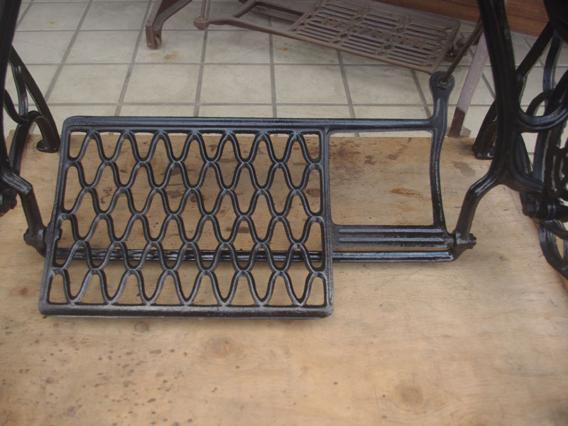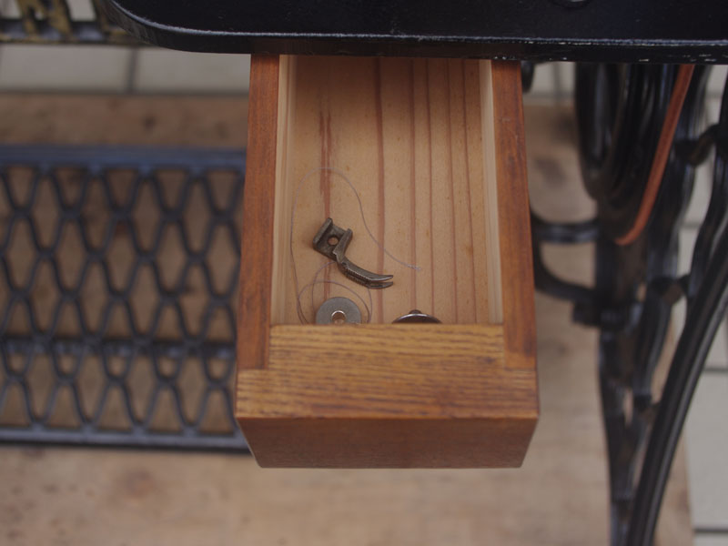 台も分解清掃と整備をおこないました。文字部分は金色が残っていましたが、これも後年に塗られたもののように見えます。違和感がなく良い感じにエイジングされているように見受けられましたので、文字と横のロゴマークの部分の塗装はそのままです。網脚部の鋳物も後年の網脚と違い、面が少し凹んだような、断面がひし形ではなく星形のような形状になっていて、これが古い網脚の特徴であるのですが、かえって陰影ができるのでよりデザイン性が増したように見えます。古いシンガーの脚はそういう点でも魅力があります!引き出しは無くなっていましたので当店にて製作いたしました。