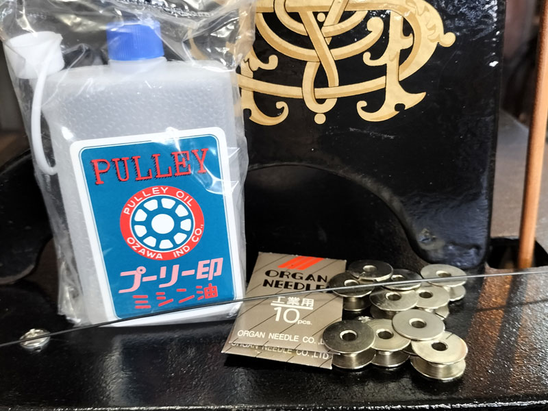 こちらにはミシン針(ご希望用途・番手を10本ずつ2種類)・ボビン10個・ミシン油・糸通し・説明書のコピーもお付けいたします。