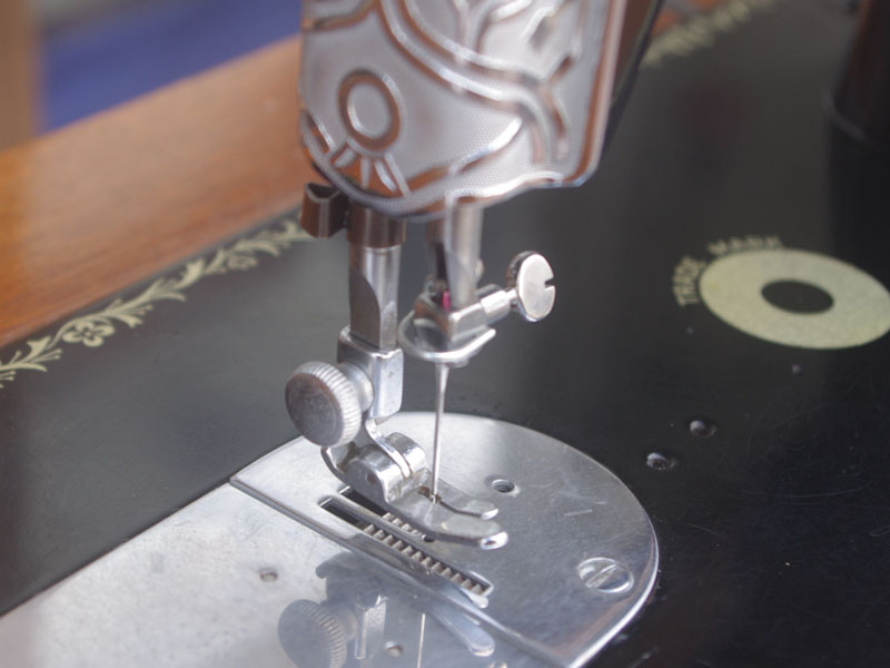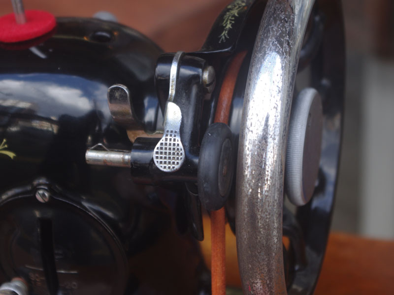こちらのミシンも分解掃除をして古い汚れや錆を落としております。また、消耗品は交換、縫製に影響する傷などを取り除き、十分に使用できる状態に整備しております。消耗品である家庭用ミシン針・ボビンケース・ボビンなど市販されています(本体装着品は新品に交換済み)。レバー操作による縫い目長さの調整、また返し縫い機能があります。送り歯の高さを調整するダイヤルも付いています。別途穴かがり器をご用意いただければ、ボタンホールも縫えます。