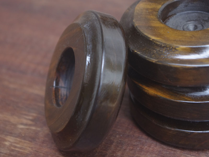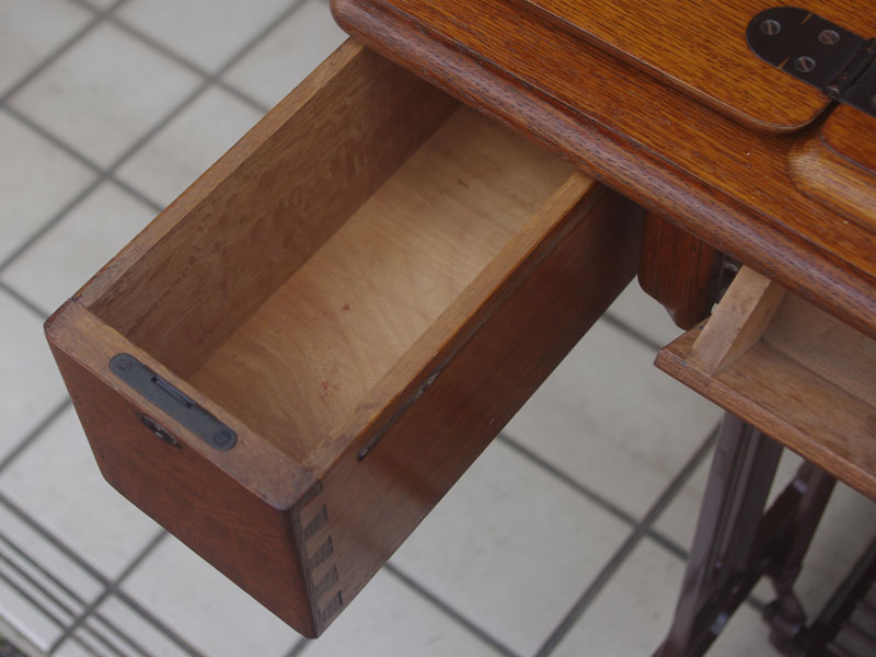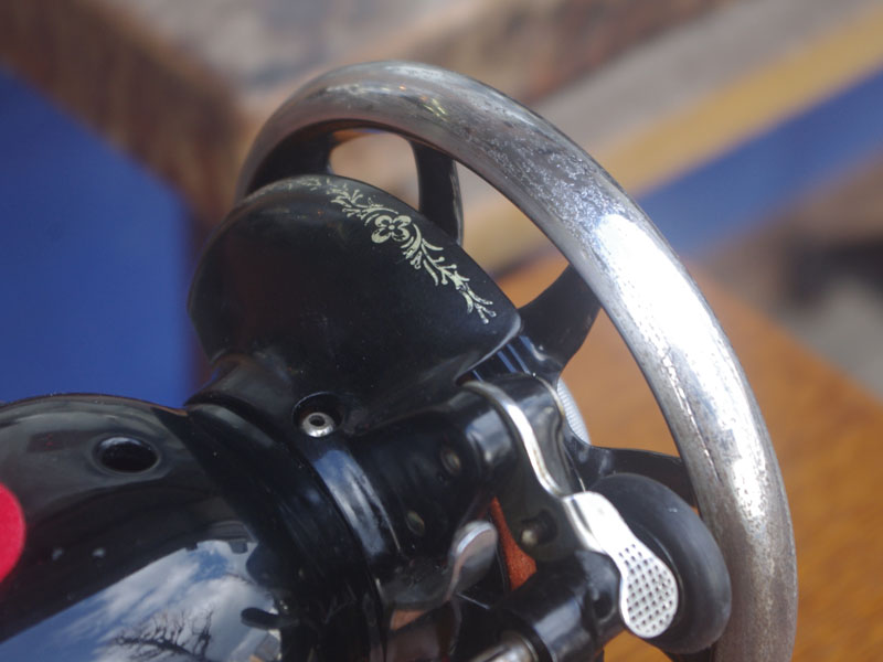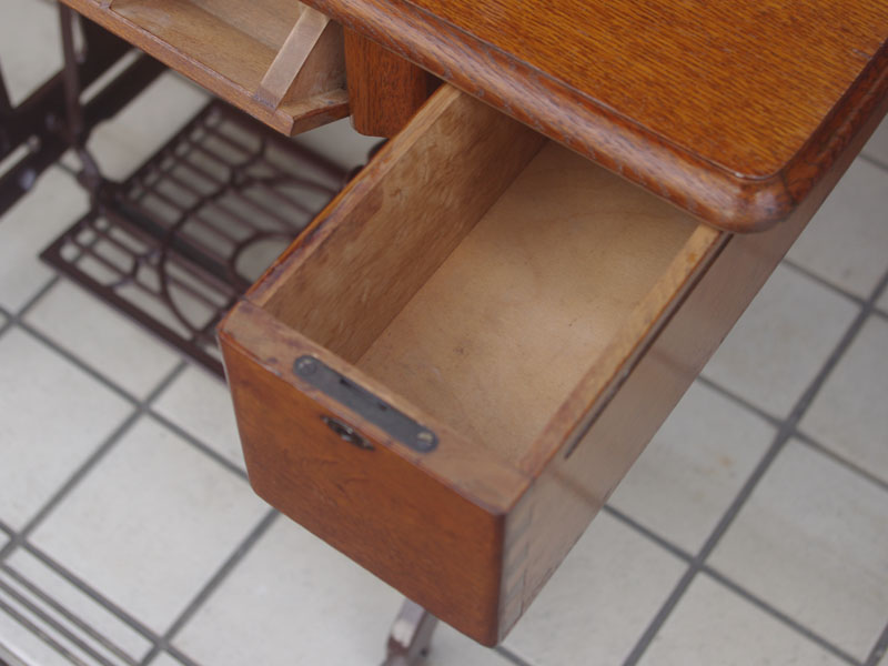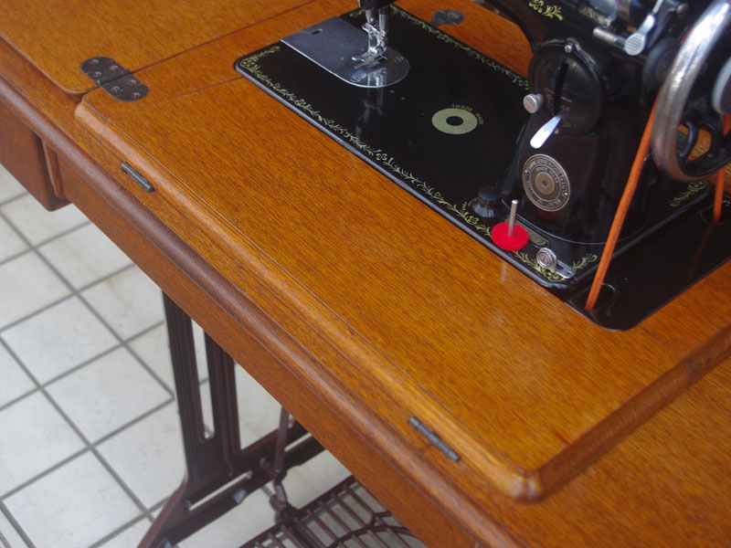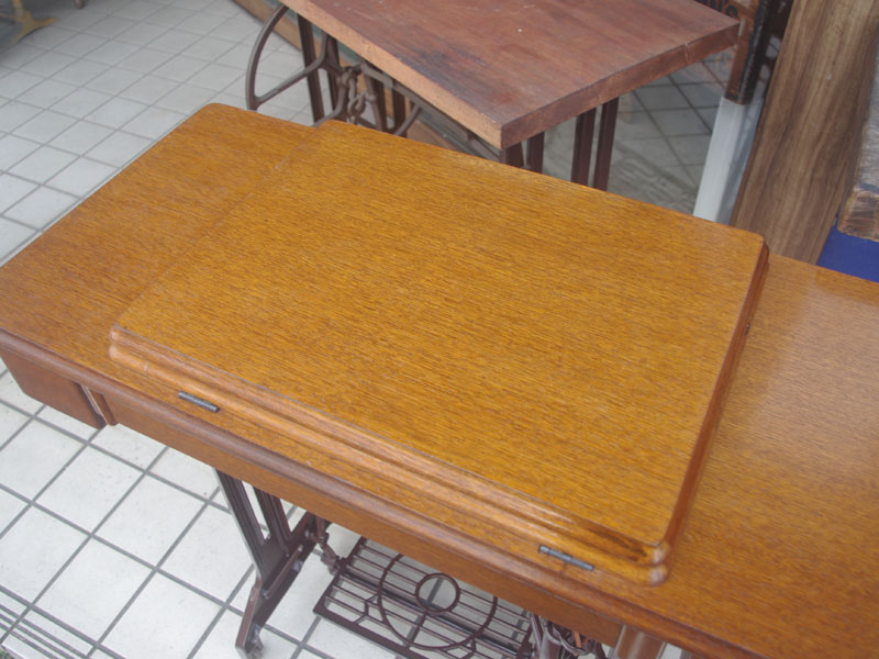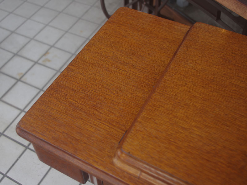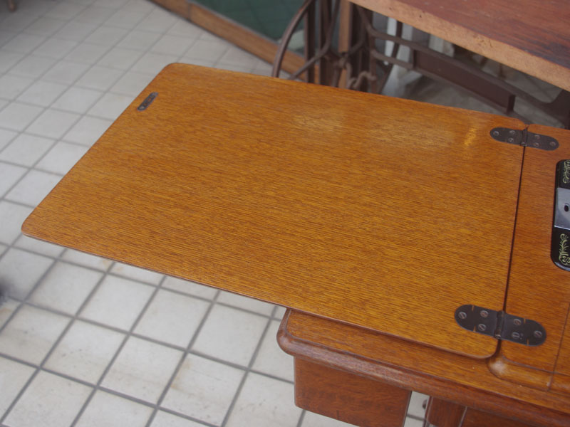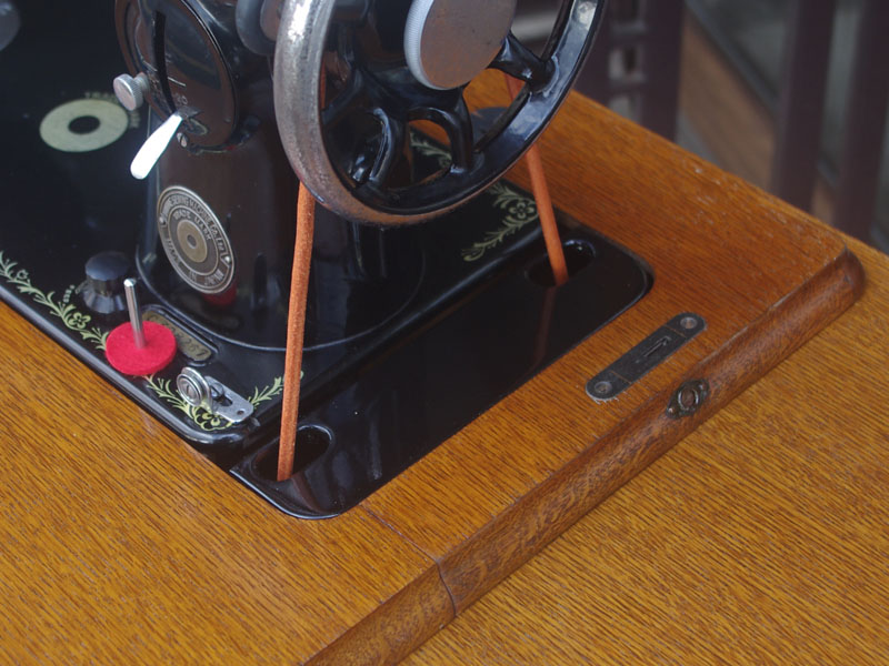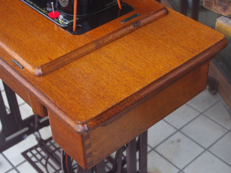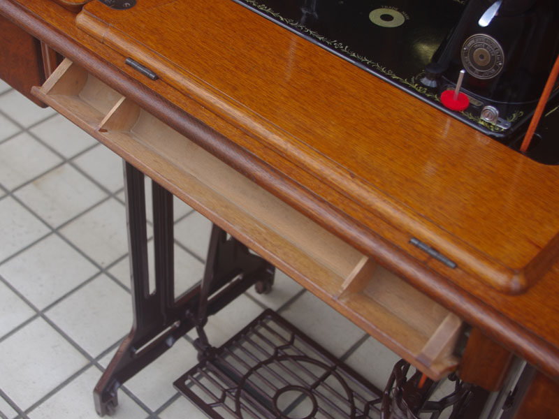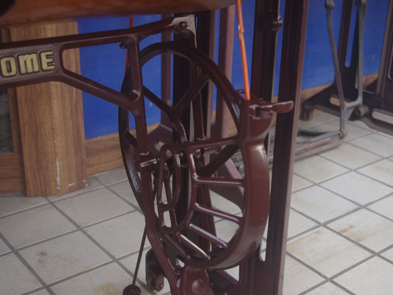 木製の台も弱っている箇所を補修し、古い塗装を落として再塗装いたしました。塗料には天然樹脂シェラックニスおよび摩耗に強いウレタンを使用しました。熱いカップやアルコール、多少の水気は問題ありませんが花瓶の水などには注意して下さい。脚は分解クリーニングをおこない再塗装をいたしました。文字の部分はオリジナルの金色が残っていましたのでそのままに。最後に調整とグリースアップ、ミシン本体とベルトで繋げて動きを確認しております。