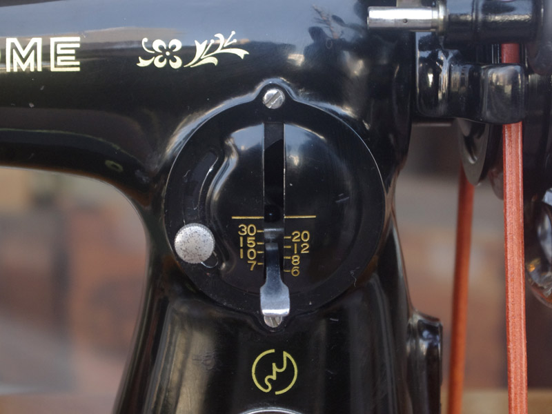 こちらのミシンも分解掃除をして古い汚れや錆を落としております。また、消耗品は交換、縫製に影響する傷などを取り除き、十分に使用できる状態に整備しております。消耗品である家庭用ミシン針・ボビンケース・ボビンなど市販されています(本体装着品は新品に交換済み)。レバー操作による縫い目長さの調整、また返し縫い機能があります。送り歯の高さを調整するダイヤルも付いています。別途穴かがり器をご用意いただければ、ボタンホールも縫えます。