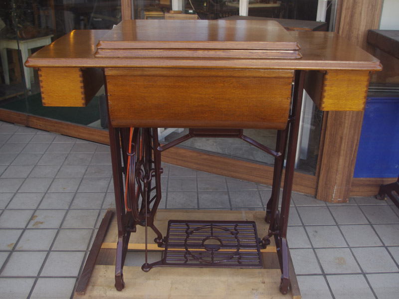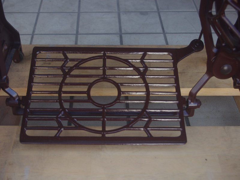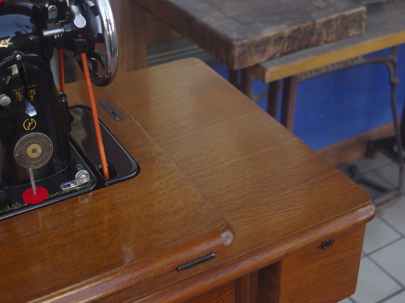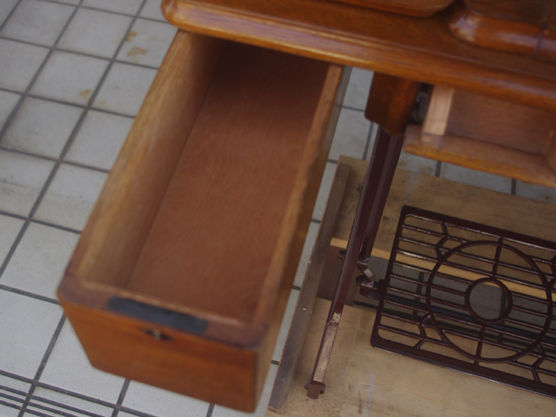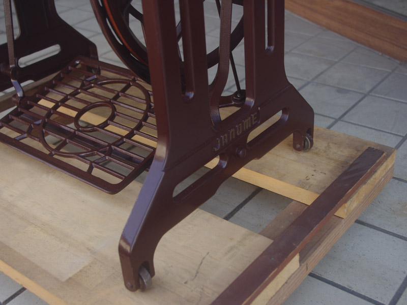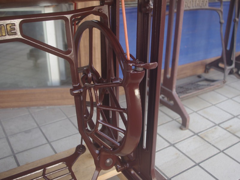 木製の台も弱っている箇所を補修し、古い塗装を落として再塗装いたしました。塗料には天然樹脂シェラックニスおよび摩耗に強いウレタンを使用しました。熱いカップやアルコール、多少の水気は問題ありませんが花瓶の水などには注意して下さい。脚は分解クリーニングをおこない再塗装をいたしました。文字の部分はオリジナルの金色が残っていましたのでそのままに。最後に調整とグリースアップ、ミシン本体とベルトで繋げて動きを確認しております。