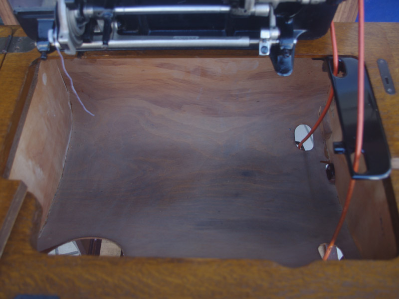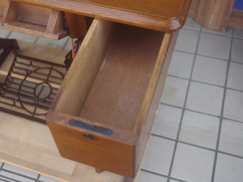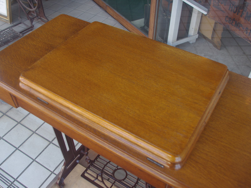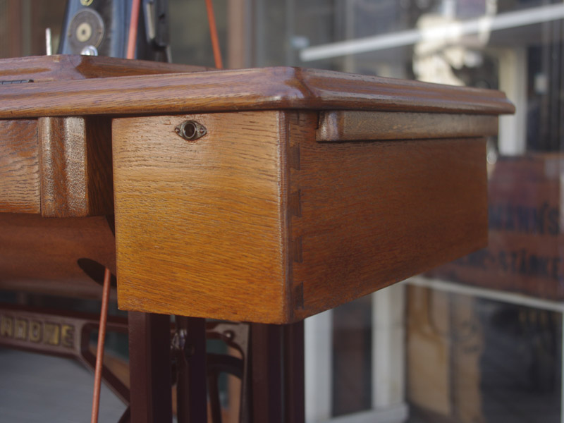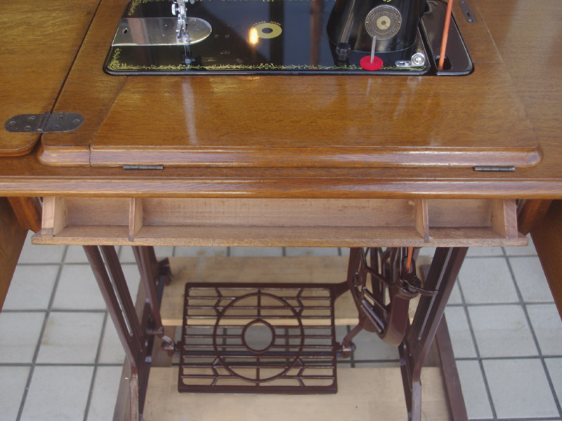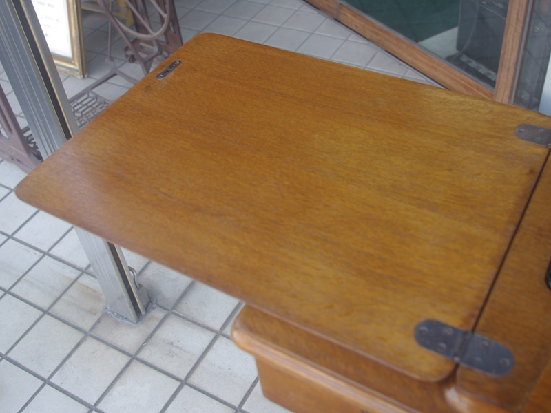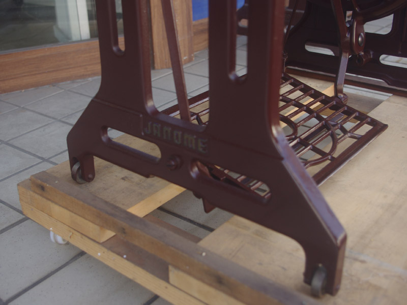 木製の台も弱っている箇所を補修し、古い塗装を落として再塗装いたしました。塗料には天然樹脂シェラックニスおよび摩耗に強いウレタンを使用しました。熱いカップやアルコール、多少の水気は問題ありませんが花瓶の水などには注意して下さい。脚は分解クリーニングをおこない再塗装をいたしました。文字の部分はオリジナルの金色が残っていましたのでそのままに。最後に調整とグリースアップ、ミシン本体とベルトで繋げて動きを確認しております。