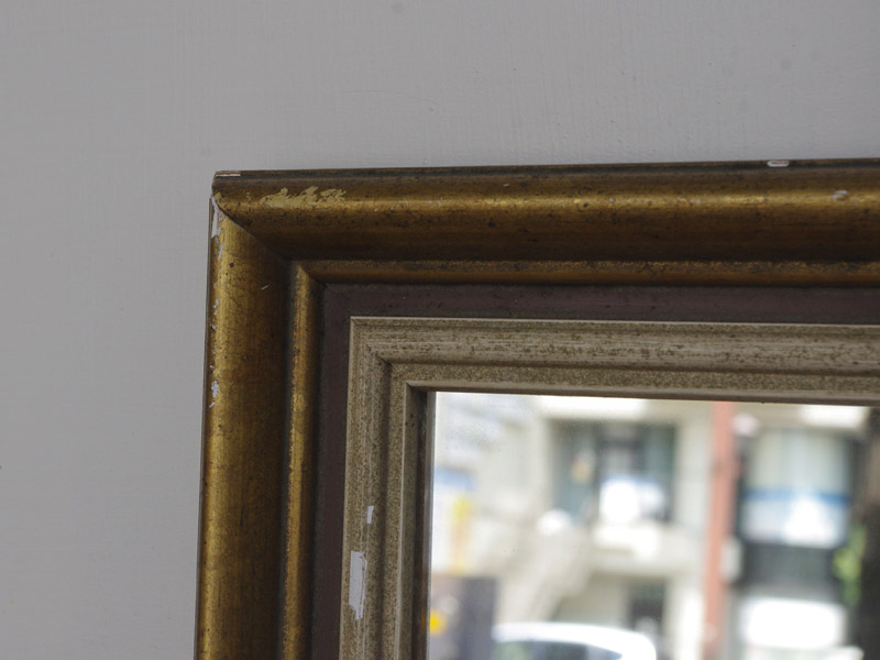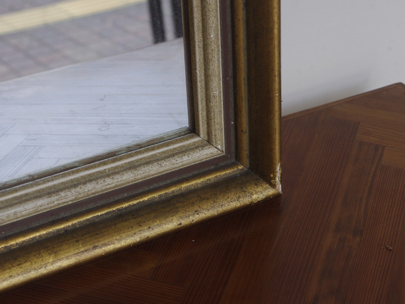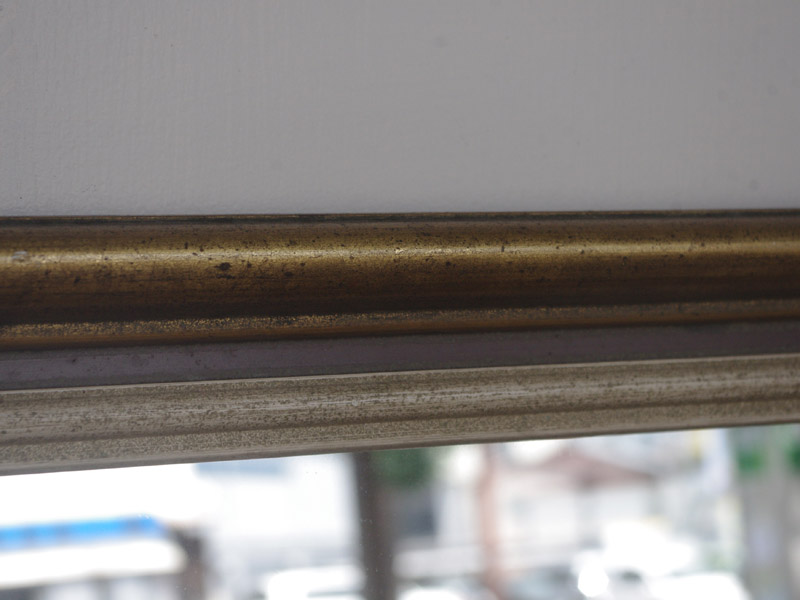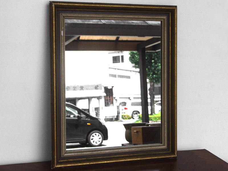 縁には色違いの箔を貼った大変凝った作りになっています。それでいて落ち着きもあります。クラシカルからシックな雰囲気まで幅広く使えるミラーです。縁が古いのはもちろんのこと、鏡も全く新しいものではなく、少し古いものを使用しています。写り方は今の鏡と全く変わりません。