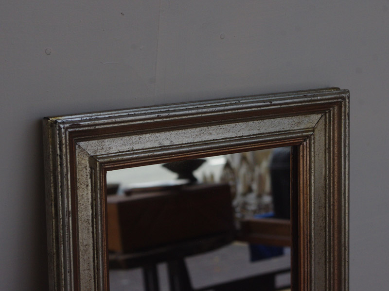 縁には色違いの光沢を抑えた箔を使用しているため落ち着いた雰囲気になっています。ちょっとしたインテリアにいいサイズです。縁が古いのはもちろんのこと、鏡も全く新しいものではなく、少し古いものを使用しています。写り方は今の鏡と全く変わりません。
