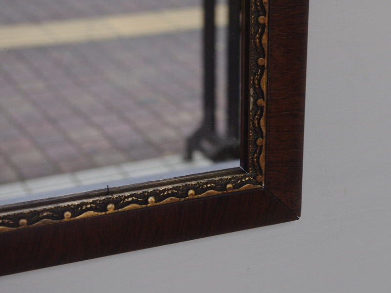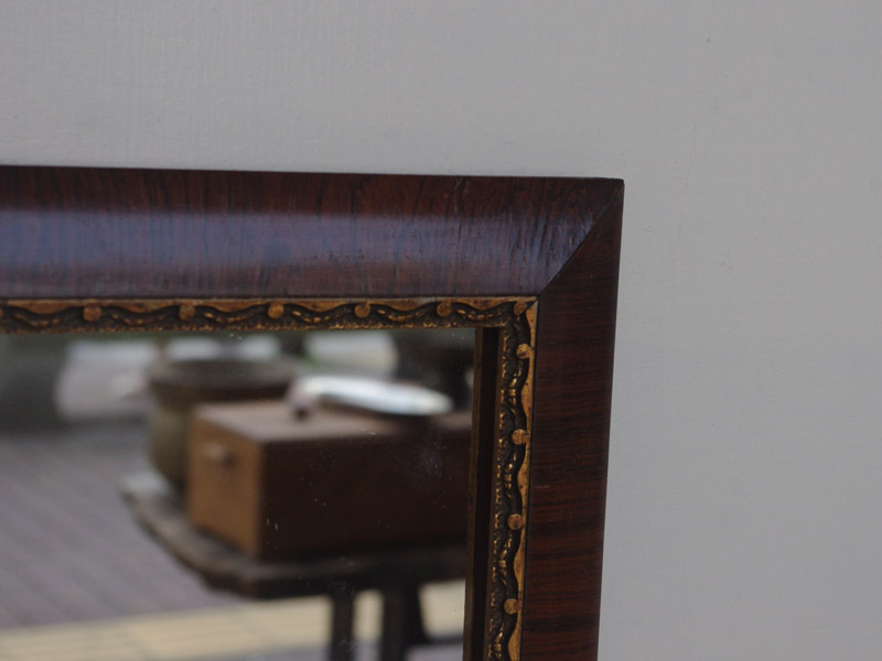 フレームには木目と彫りの両方を並べてデザインされています。雰囲気は色が濃いめのために落ち着いていますが、彫りの金色が効いて優雅さも感じさせてくれます。中くらいのサイズの鏡ですので玄関などにかけていて出かけるときのチェックに、などに使えそうです。