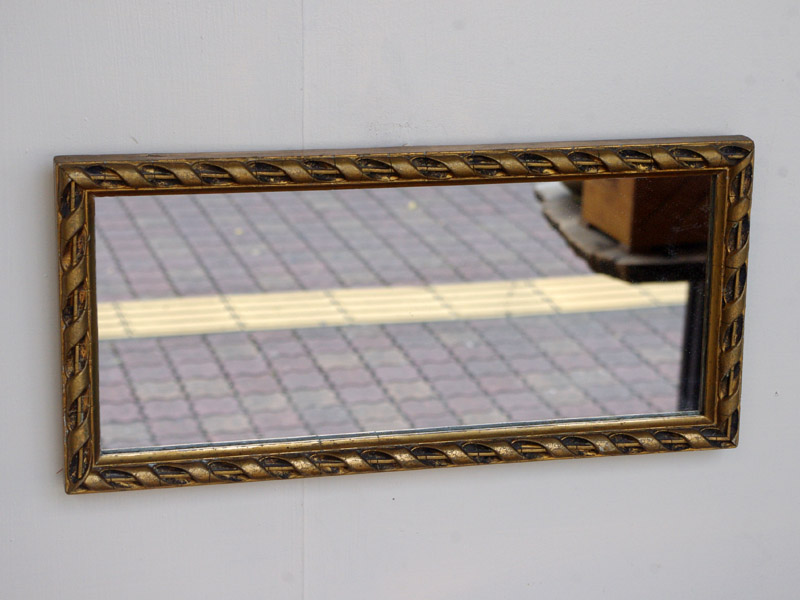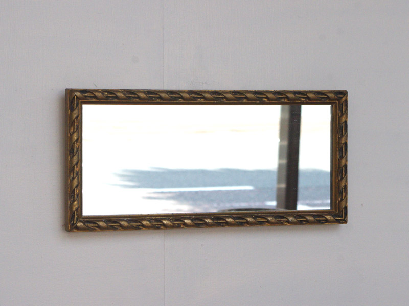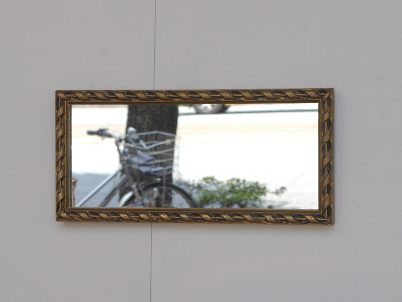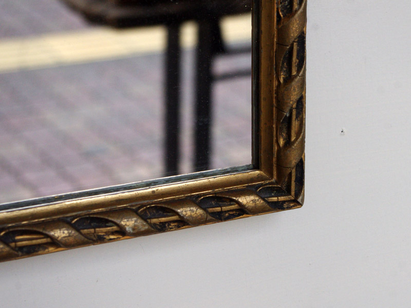 縁部分はリボンをねじったようなデザインで、とても丁寧に作られています。金色が豪華ですね。珍しく横に長い鏡です。もちろん縦にしても面白そうですね。おそらく絵に合わせて造られた特注品だったかと思います。