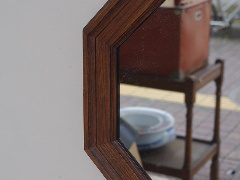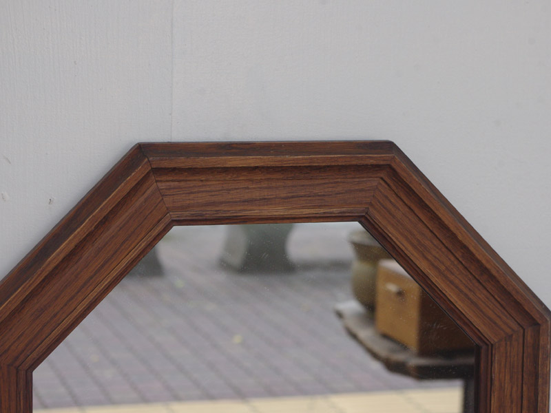 正六角形のユニークな鏡です!木の質もよくイギリスのアンティーク家具にもよく似ています。ドイツから届きましたが元はイギリスにあったものの可能性もあるかもしれません。今回訳ありでミラー部分の下の端に線が入ったような場所があります。その分ぐっとお値引きをしております。