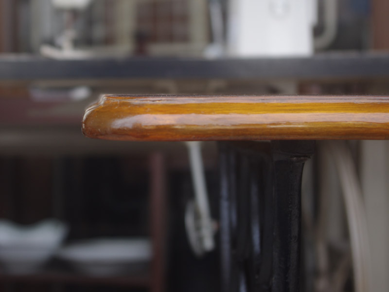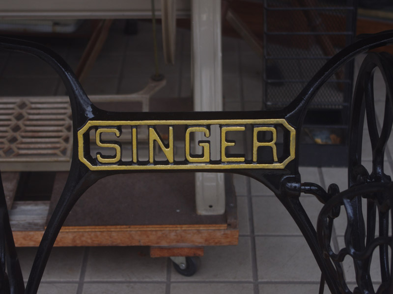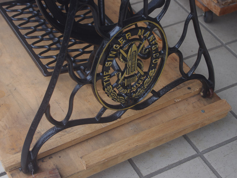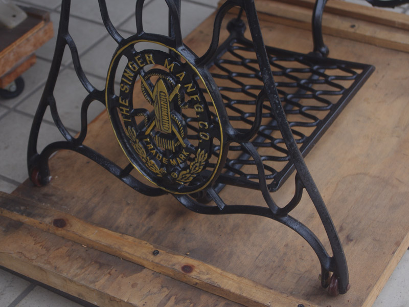 脚は1900年前後にのみ使用されていたシンガー製の足踏みミシン鉄脚です。素材は鉄の鋳物。こちらはクリーニングをして再塗装し、前方のSINGERの文字や横のマークを再塗装をいたしました。