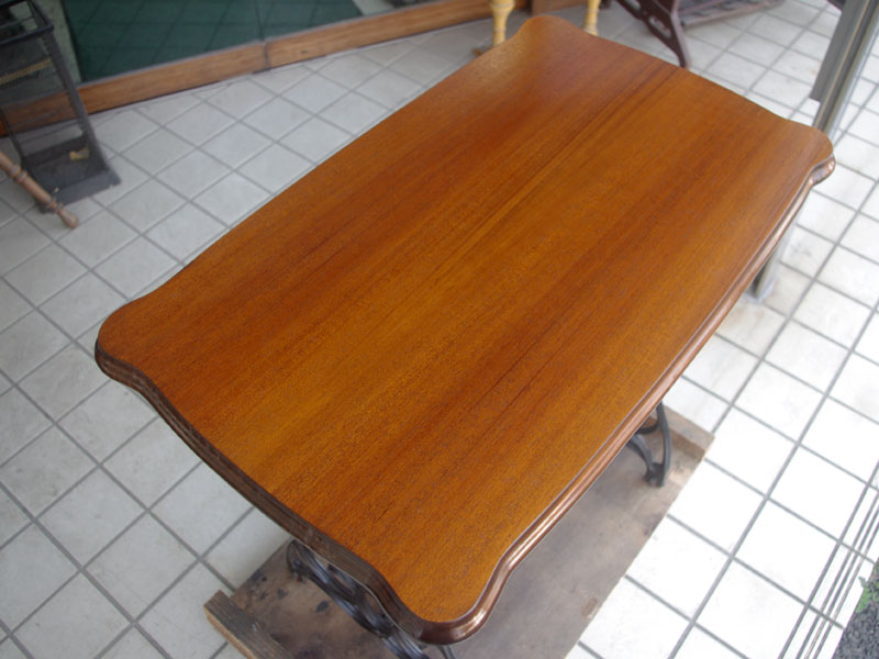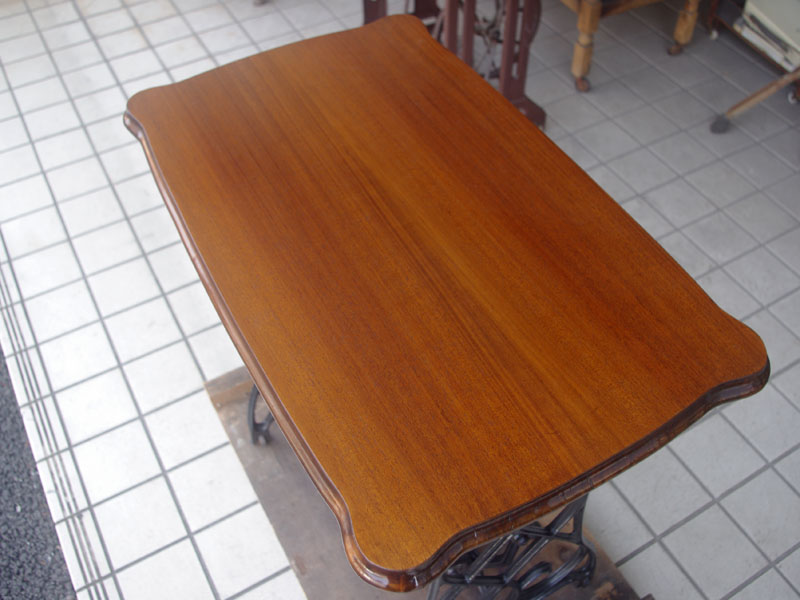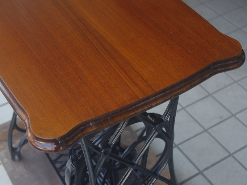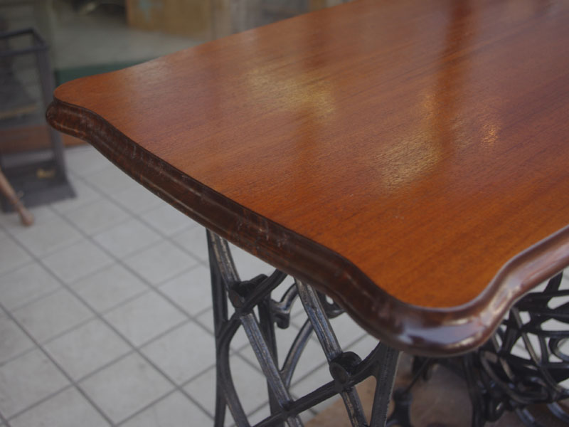 古いアンティークミシン鉄脚のリメイクテーブルが完成いたしました!テーブルトップがアールヌーヴォー風の曲線で形作られたデザインになっております。こちらは本物のアンティークミシンで使われていたデザインを当店にて一部修正して製作いたしました。脚の曲線と合わせて天板も柔らかいイメージになります!天板のベースとなる木は針葉樹系で厚さが30mm程、表面に銘木であるマホガニー柾目の突き板を貼りました。