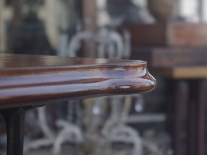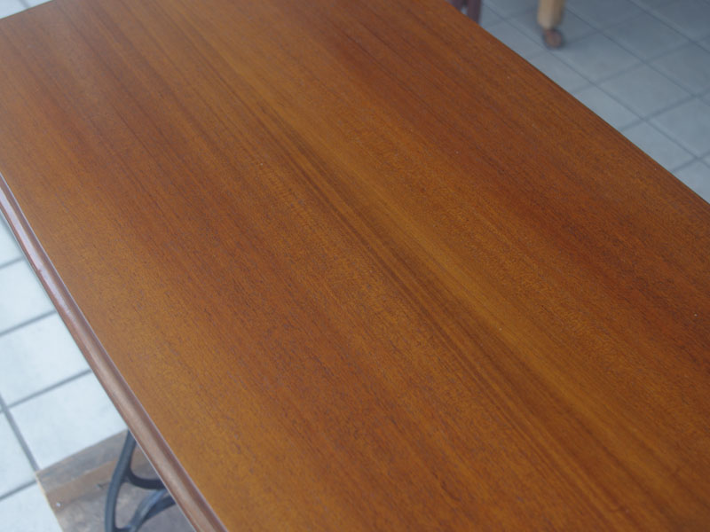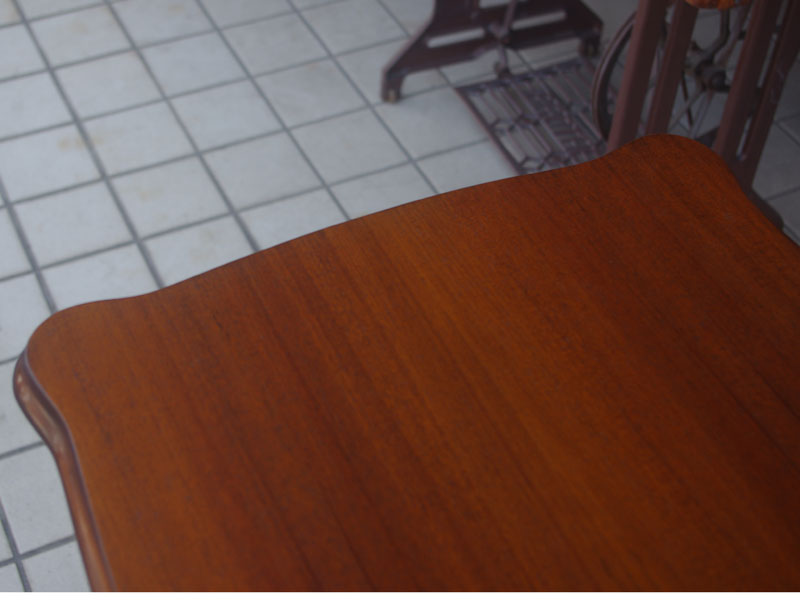 天板の色は写真で明るく見えておりますが飴色に近い色味です。マホガニーに見られるような赤黒さはあまりありません。やや光沢のある木ですので上品な雰囲気ですね。使用した塗料は海外のアンティーク家具に用いられる天然樹脂のシェラックニスと、トップコートに耐久性を持たせるためにウレタンを使用しました。シェラックは熱いカップなどの熱は苦手ですのでご注意ください。突き板も天然木のためムラやへこみがありますのでその点ご承知おきください。