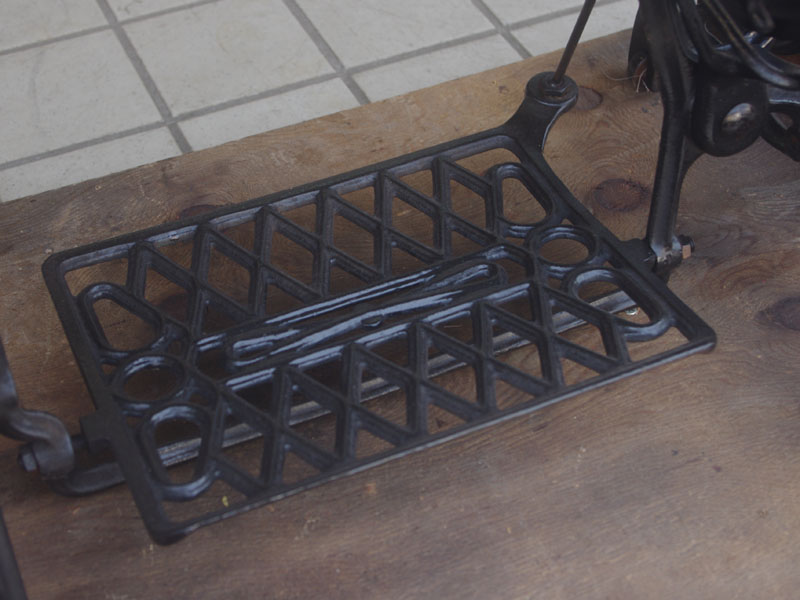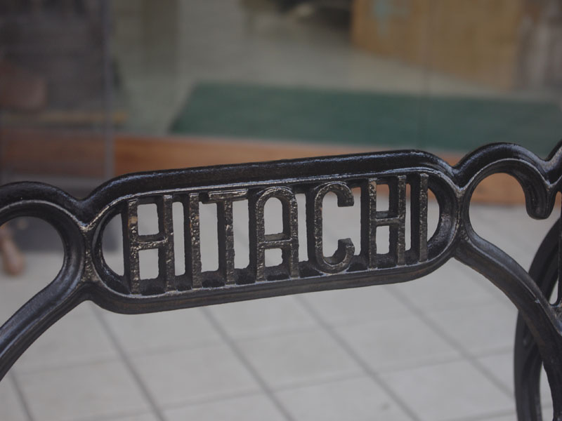 脚は日本のHITACHIとなっておりますが正確な製造年代は良く分かりません。デザインはこちらもアールヌーヴォーの曲線を思わせるもので、鋳物は太く、この特徴は19世紀の海外の網脚とよく似ています。細い鋳物が主流になるのは1900年以降ですので、こちらの脚は転換期の1900年代の前半ではないかと推測しています。脚はクリーニングをしてみると古い塗料の状態が良かったので部分的にのみ再塗装をいたしました。